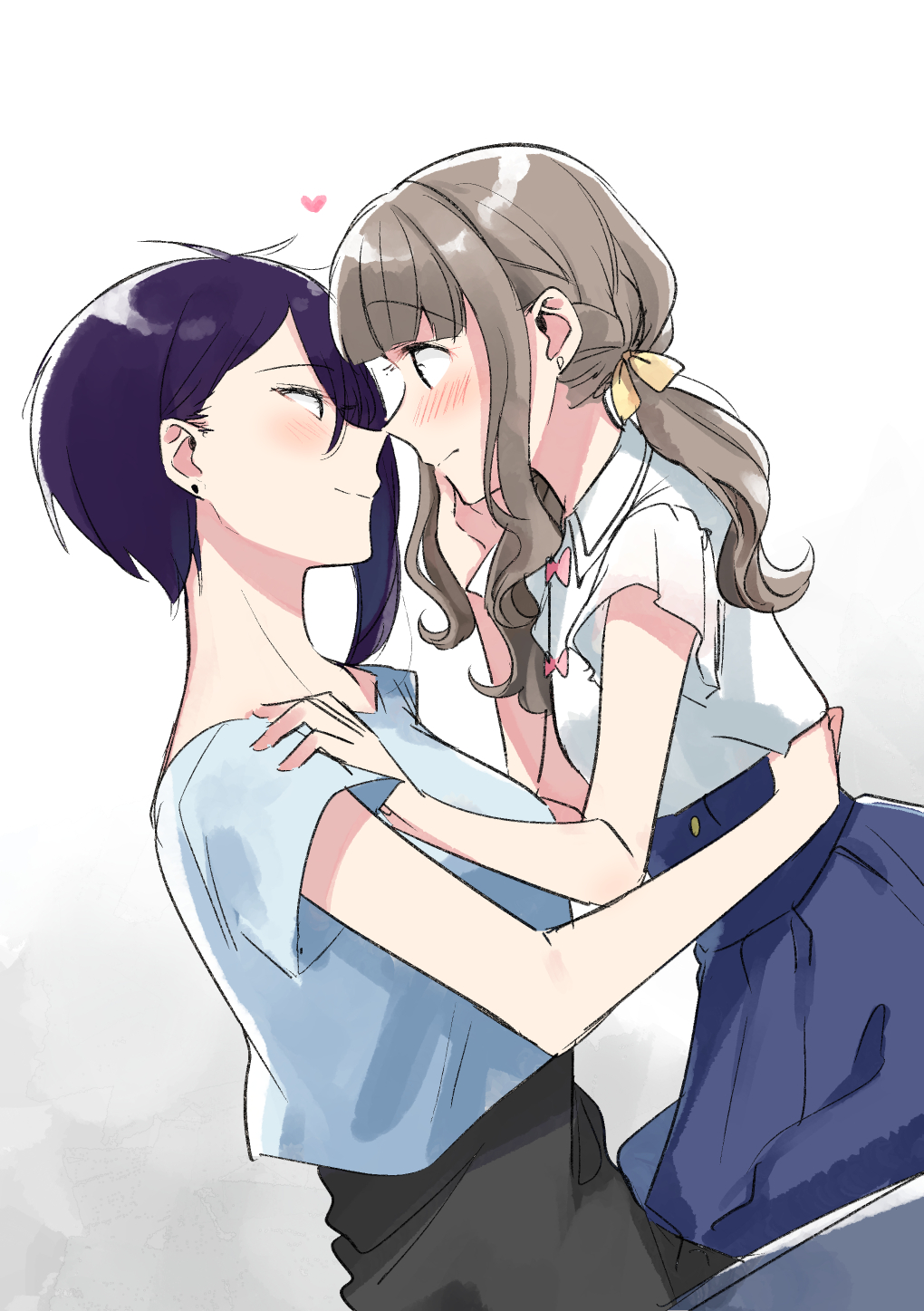 2girls asymmetrical_hair ayukawa_hinami blue_shirt blue_skirt blunt_bangs blush braid brown_hair closed_mouth collared_shirt commentary_request cowboy_shot dutch_angle earrings eye_contact french_braid hand_on_another's_cheek hand_on_another's_face hand_on_another's_shoulder hand_on_another's_waist heart highres hiiragi_shiki ikemen_sugi_desu_shiki-senpai! jewelry long_hair looking_at_another low-tied_long_hair medium_hair multiple_girls partial_commentary purple_hair shirt short_sleeves sidelocks simple_background skirt stud_earrings white_background white_shirt yuama yuri