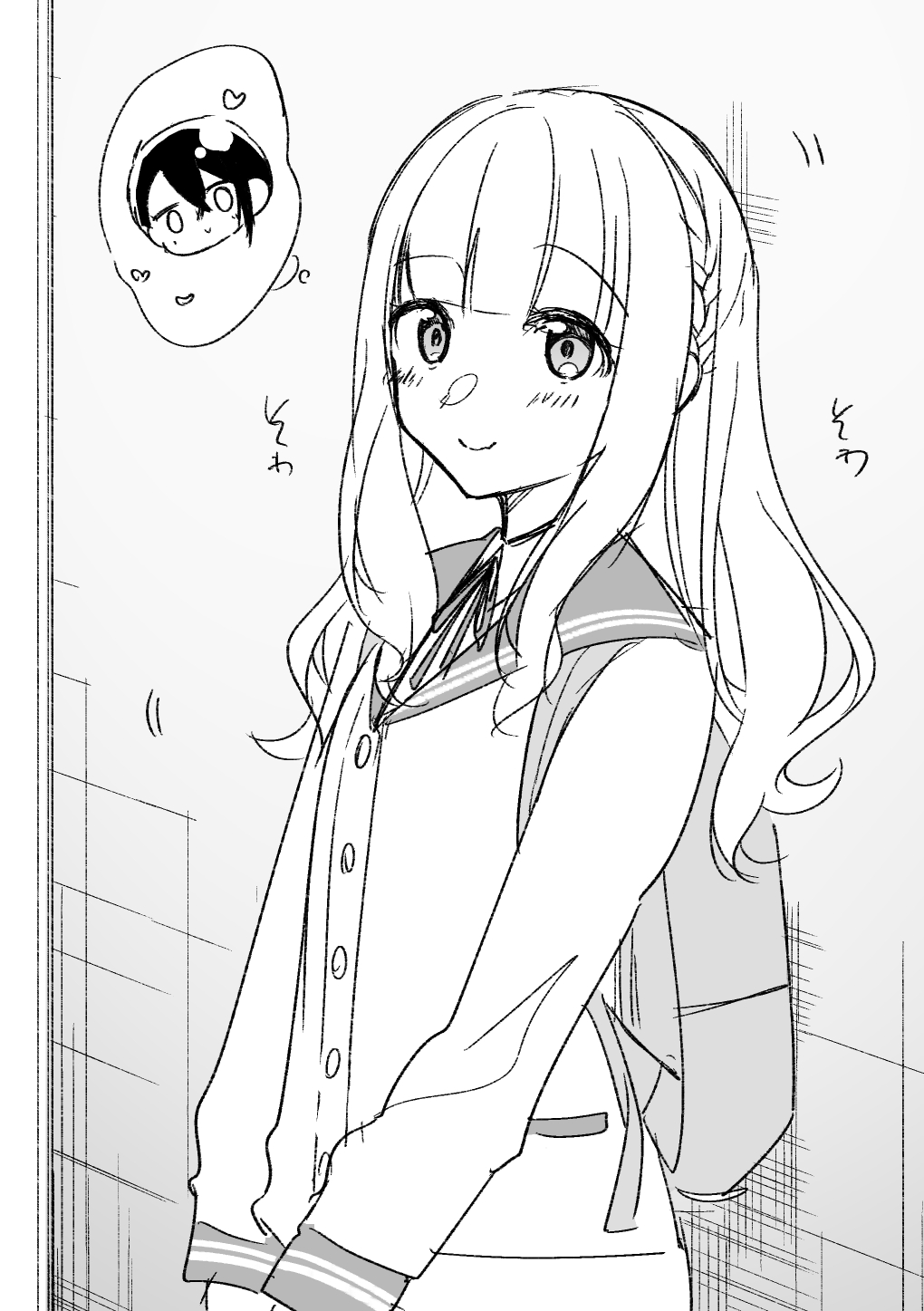 1girl ayukawa_hinami backpack bag braid cardigan collared_shirt commentary_request cowboy_shot dress_shirt french_braid greyscale heart highres hiiragi_shiki ikemen_sugi_desu_shiki-senpai! long_hair long_sleeves looking_at_viewer monochrome neck_ribbon partial_commentary ribbon sailor_collar shirt sidelocks solo speech_bubble thought_bubble yuama