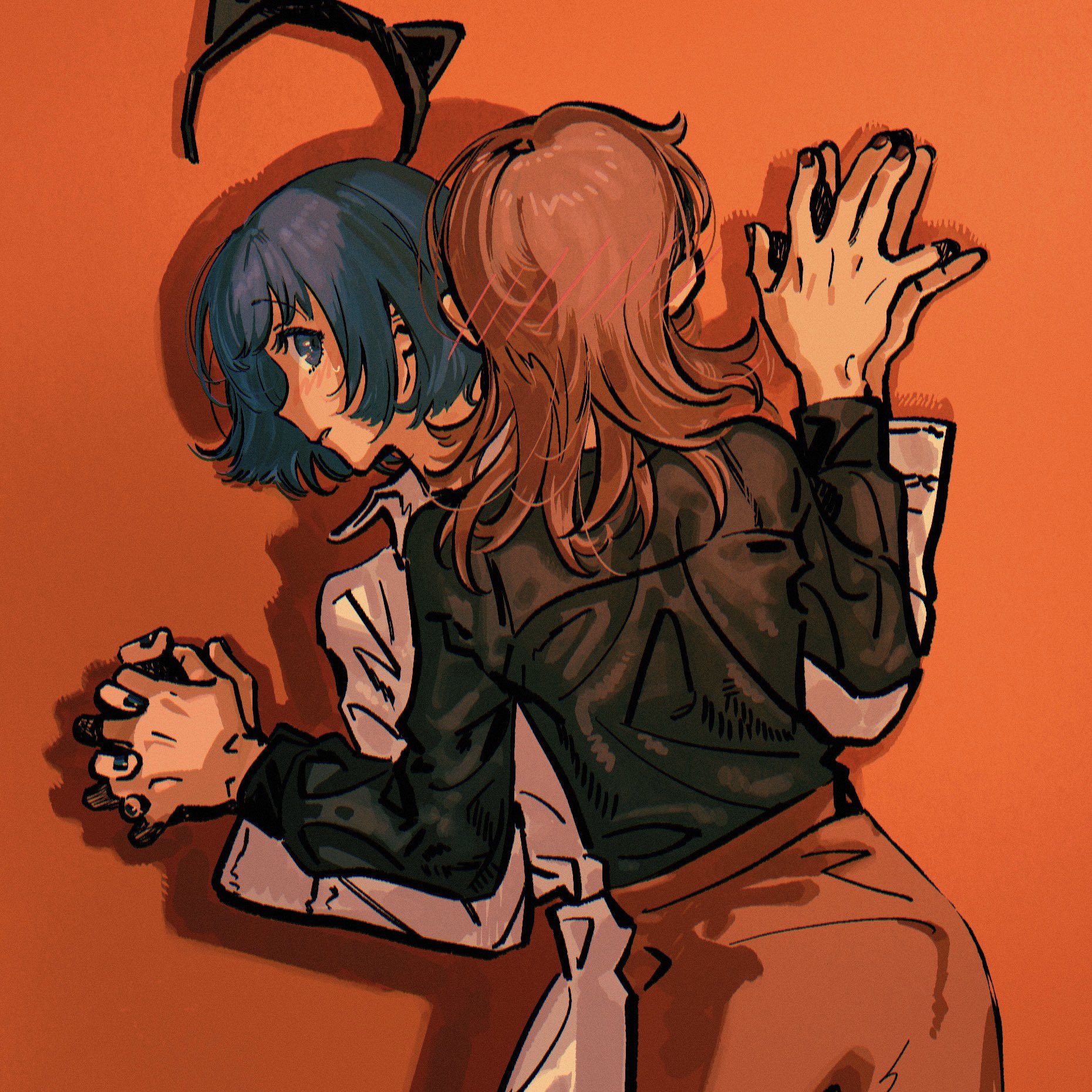 2girls animal_ear_hairband animal_ears black_hairband black_shirt blue_eyes blue_hair blue_nails blush_visible_through_hair brown_hair brown_skirt cat_ear_hairband cat_ears collared_shirt commentary_request cowboy_shot dress_shirt fake_animal_ears hairband hanasato_minori highres holding_hands interlocked_fingers kani_(kaniya) kiritani_haruka long_hair long_sleeves multiple_girls nail_polish orange_background orange_nails parted_lips project_sekai shadow shirt short_hair simple_background skirt sweatdrop unworn_hairband white_shirt yuri