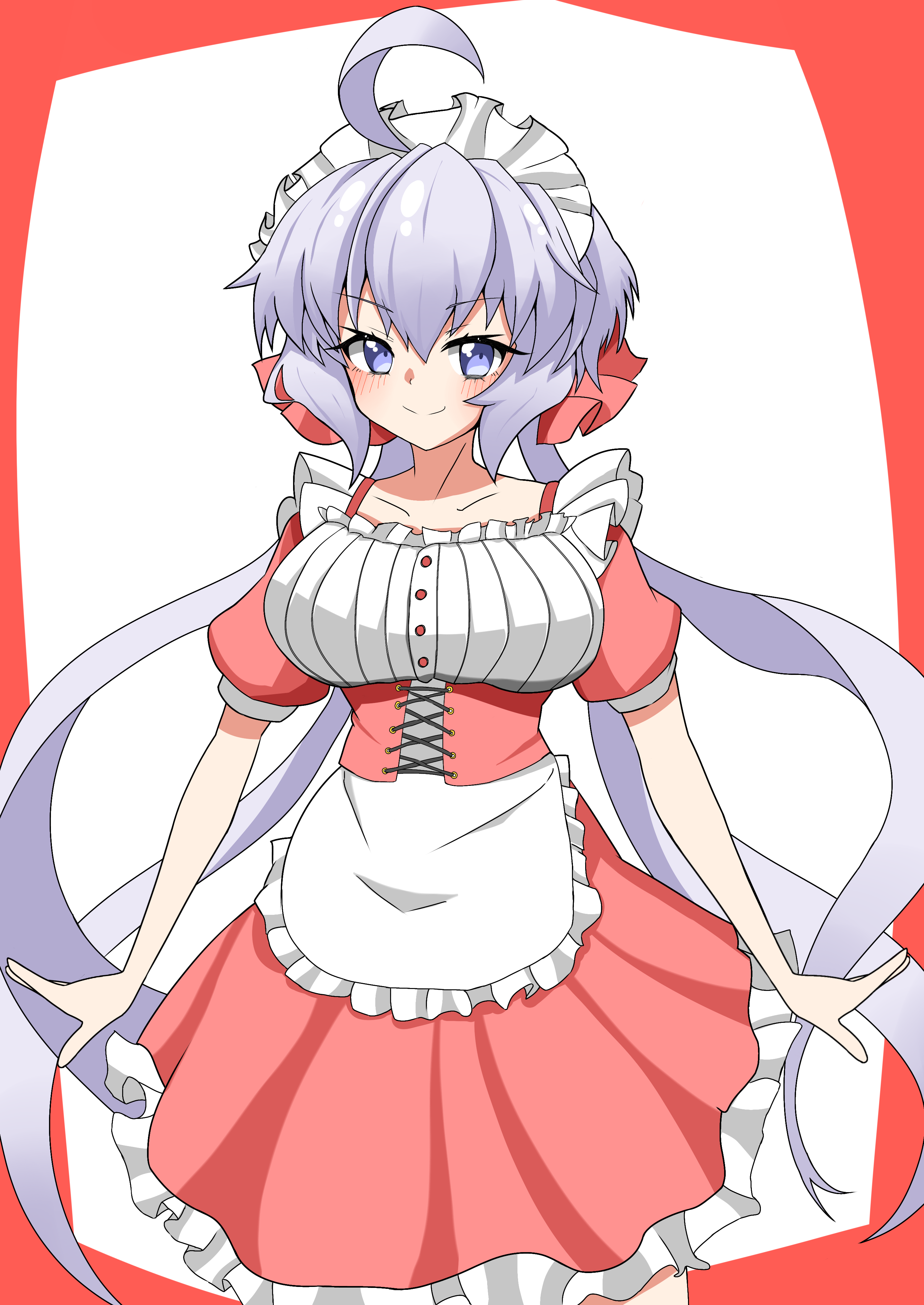 1girl 9ma_(9matohibari) absurdres ahoge apron blue_eyes blush breasts closed_mouth corset dress eyebrows_hidden_by_hair feet_out_of_frame frilled_dress frills hair_between_eyes hair_ribbon highres large_breasts long_bangs long_hair looking_at_viewer maid maid_apron maid_headdress red_corset red_dress red_ribbon ribbon senki_zesshou_symphogear simple_background smile solo very_long_hair white_apron white_hair white_headdress yukine_chris