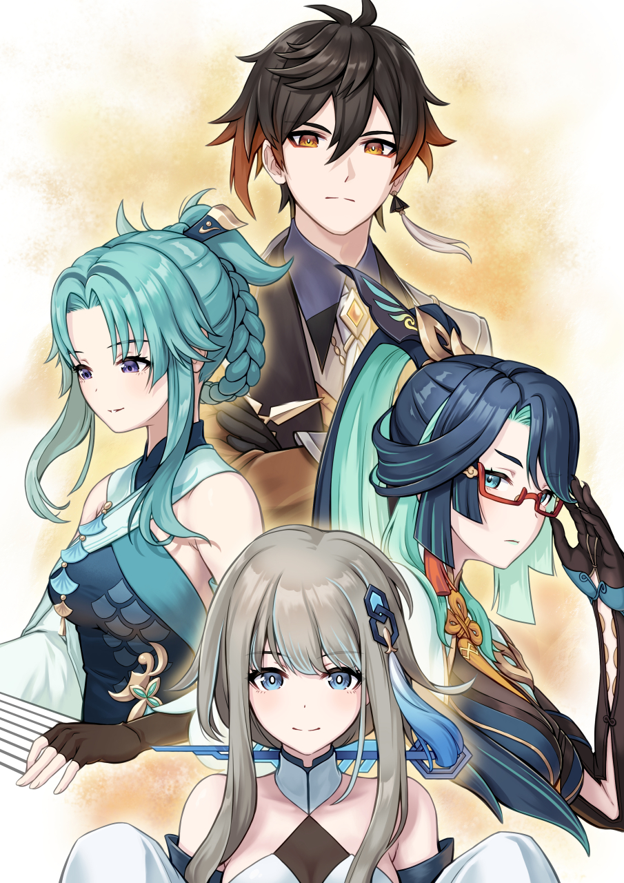 1boy 3girls adjusting_eyewear aqua_eyes aqua_hair aqua_lips bare_shoulders black_gloves black_hair blue_eyes blue_hair braid breasts brown_hair chinese_hairpin cloud_retainer_(genshin_impact) colored_inner_hair commentary detached_sleeves earrings eyeliner eyeshadow formal_clothes genshin_impact glasses gloves gradient_hair green_hair green_lips grey_hair guitaristkaz guizhong_(genshin_impact) hair_between_eyes hair_ornament hand_on_eyewear highres jacket jewelry large_breasts long_hair long_sleeves looking_at_viewer madame_ping_(genshin_impact) makeup medium_breasts multicolored_hair multiple_girls necktie purple_eyes red-framed_eyewear red_eyeshadow semi-rimless_eyewear shirt single_earring sleeves_past_fingers sleeves_past_wrists smile suit tassel tassel_earrings tassel_hair_ornament two-tone_hair white_necktie xianyun_(genshin_impact) yellow_eyes zhongli_(genshin_impact)