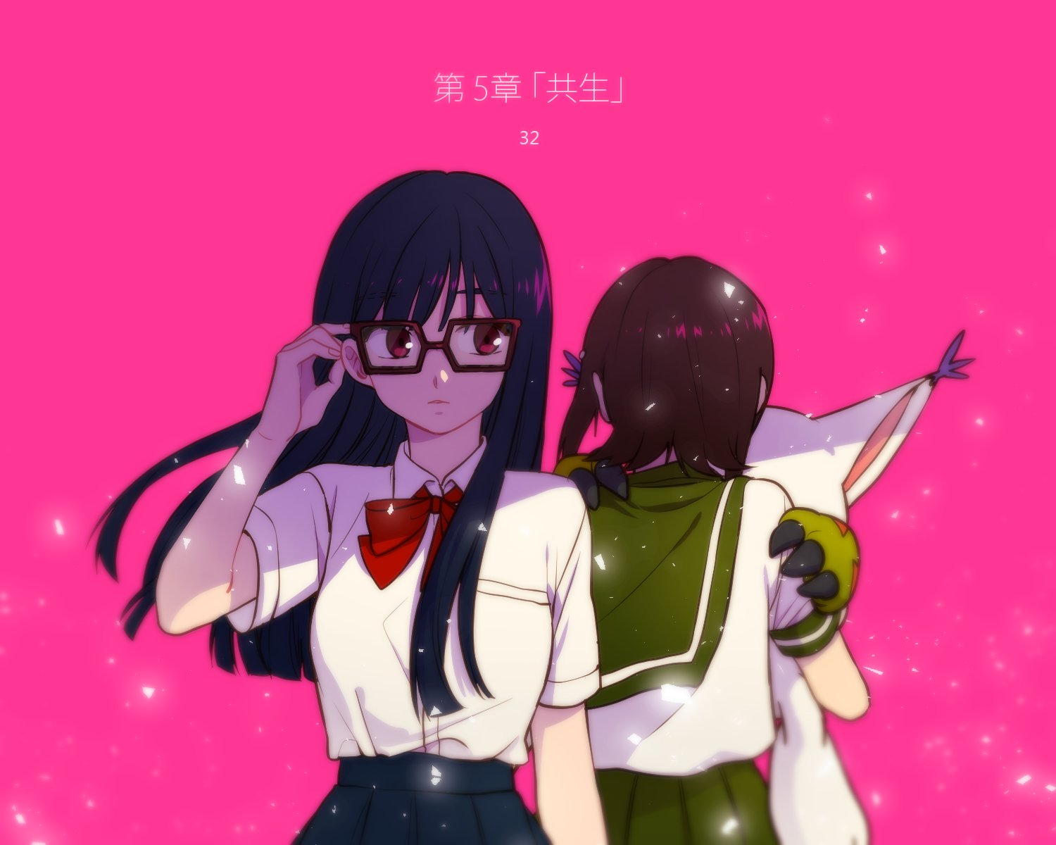 2girls cat digimon digimon_(creature) digimon_adventure_tri. glasses gloves highres mochizuki_meiko multiple_girls tailmon yagami_hikari