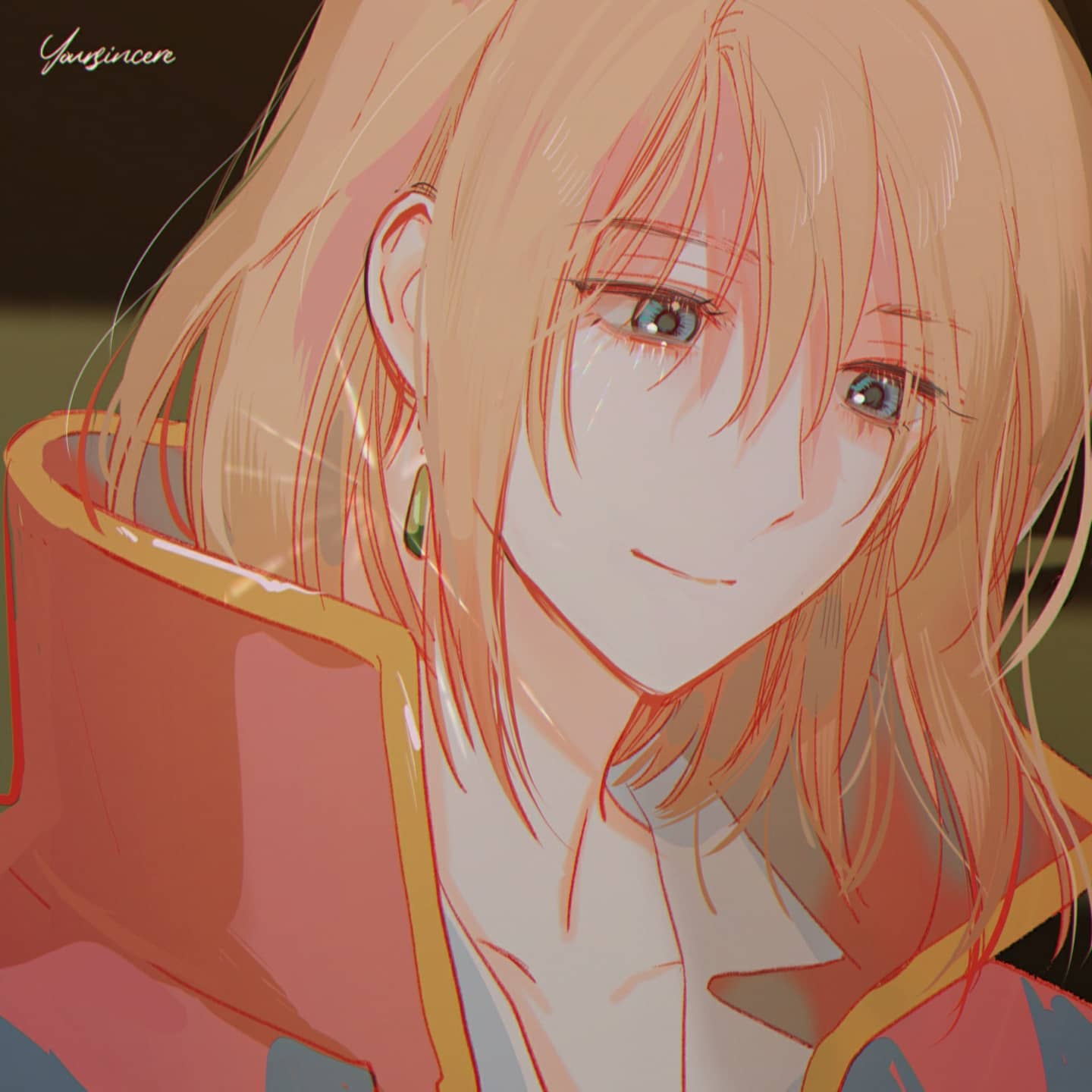 1boy blonde_hair blue_eyes close-up collared_coat commentary_request earrings hair_between_eyes highres howl_no_ugoku_shiro howl_(howl_no_ugoku_shiro) jewelry light_smile looking_down male_focus medium_hair shirt sidelocks solo white_shirt yoursincere