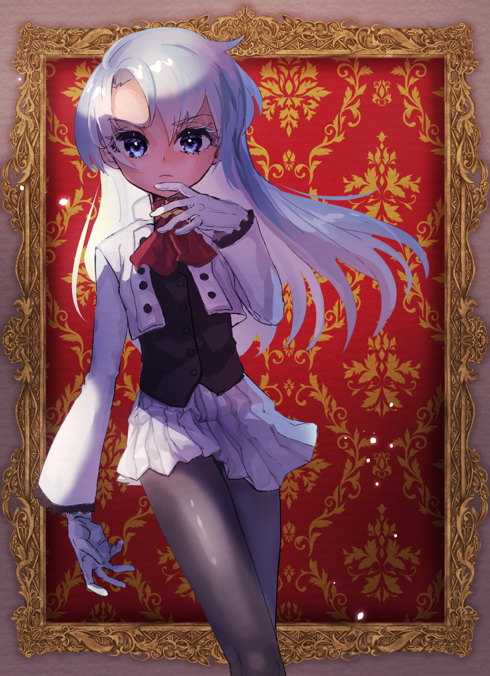 1girl ascot black_pantyhose black_shirt gloves hair_between_eyes highres jacket long_hair looking_at_viewer mutsuba_asaka open_clothes open_jacket pantyhose photo_background pleated_skirt purple_eyes red_ascot shirt skirt white_gloves white_hair yu-gi-oh! yu-gi-oh!_go_rush!! yuzutaroman