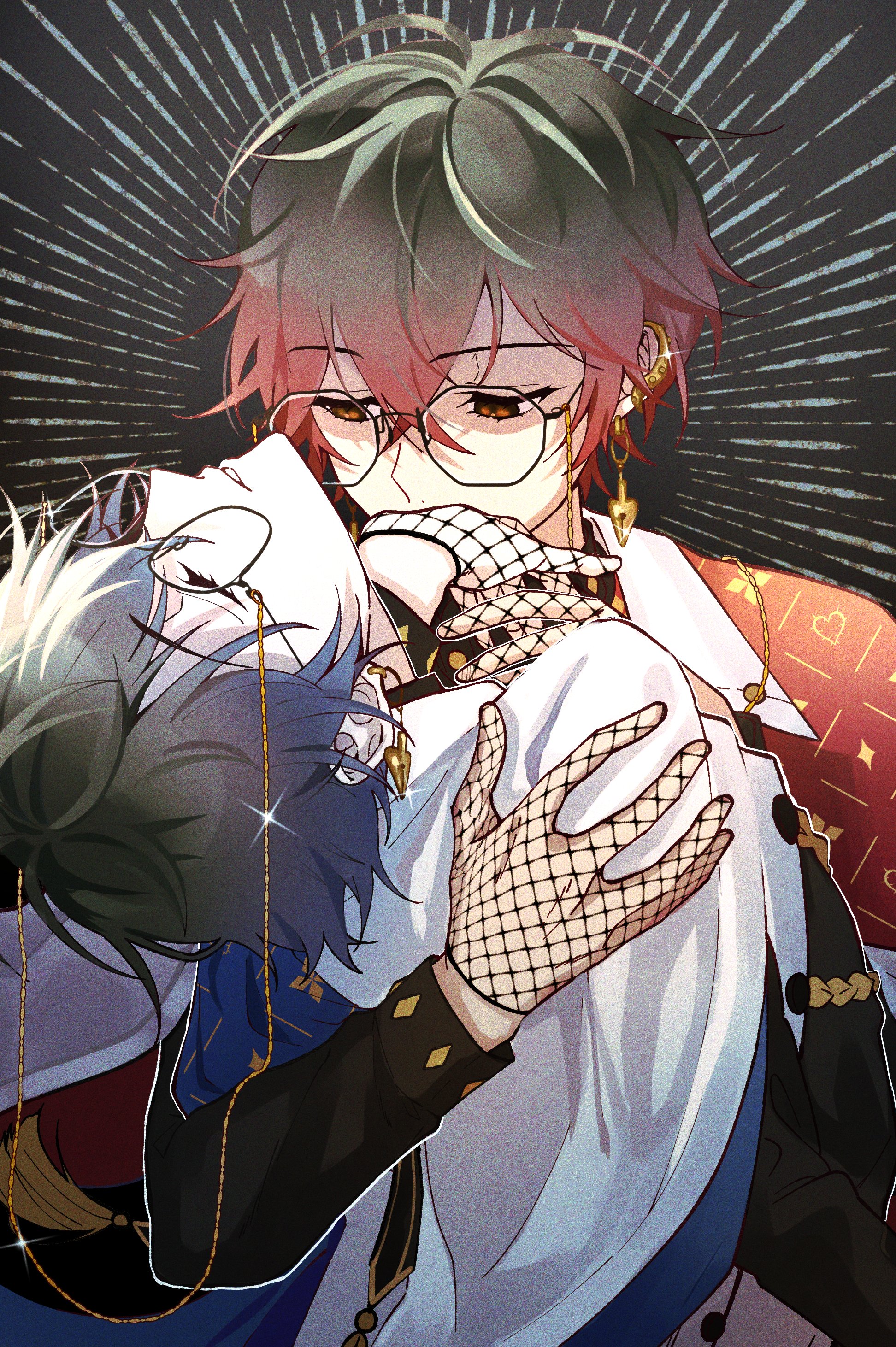 2boys absurdres arched_back black_shirt blue_hair brown_eyes closed_eyes earrings eki_eveland eyewear_strap film_grain fishnet_gloves fishnets glasses gloves gradient_hair green_hair halo halo_behind_head highres ike_eveland ike_eveland_(1st_costume) jewelry kiss kissing_hand long_sleeves male_focus multicolored_hair multiple_boys narrowed_eyes nijisanji nijisanji_en oyakodon_ena red_hair shirt sparkle upper_body virtual_youtuber yaoi