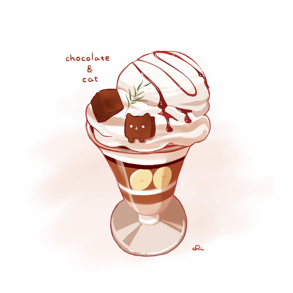 animal-themed_food banana banana_slice brownie_(food) cat chai_(drawingchisanne) chocolate chocolate_syrup commentary_request cup english_text food food_focus fruit garnish ice_cream no_humans original parfait
