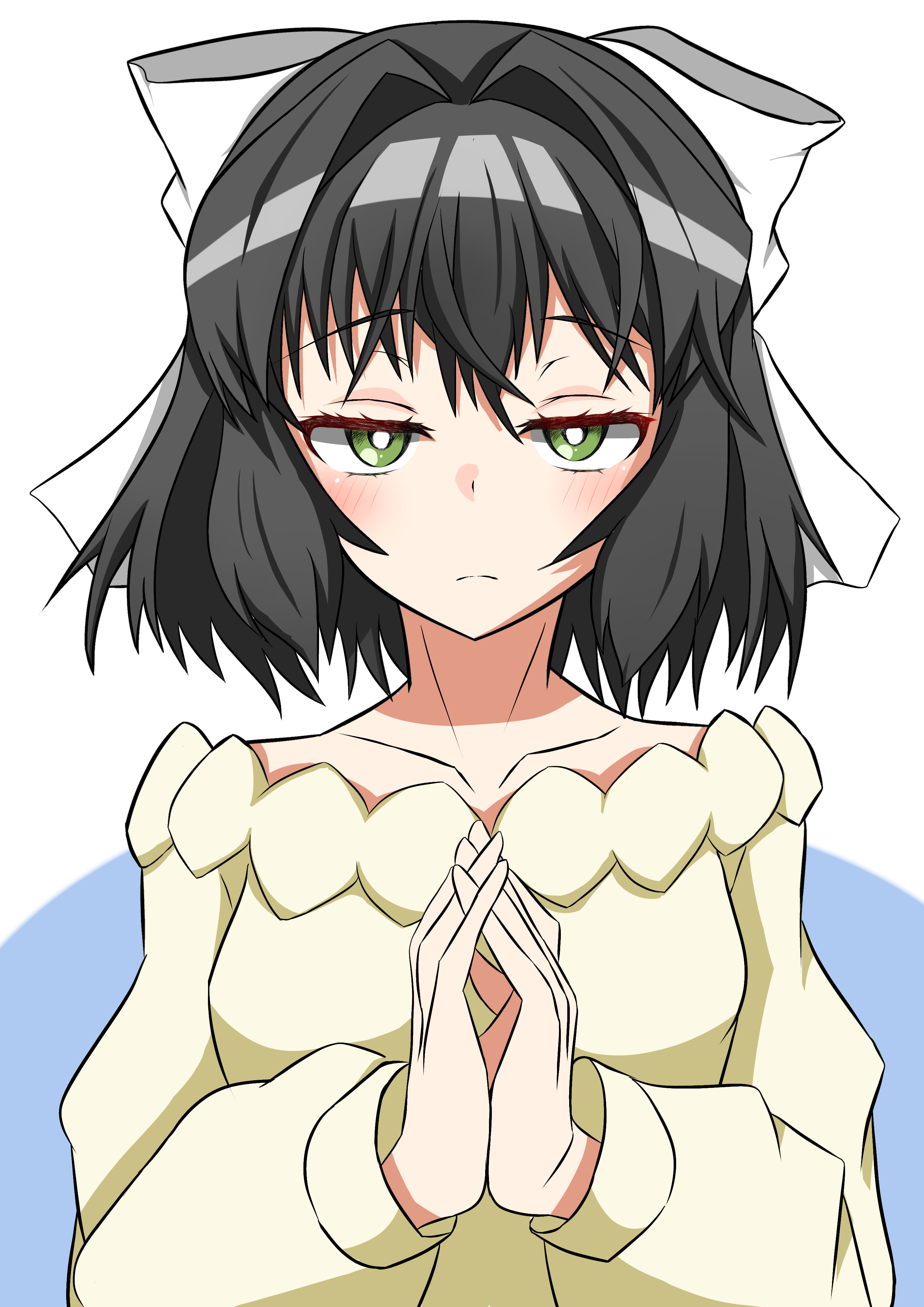 1girl 9ma_(9matohibari) absurdres black_hair breasts eyebrows_hidden_by_hair green_eyes hair_ribbon highres kohinata_miku large_ribbon light_frown looking_at_viewer own_hands_clasped own_hands_together ribbon senki_zesshou_symphogear short_hair simple_background small_breasts solo sweater unamused upper_body white_ribbon white_sweater