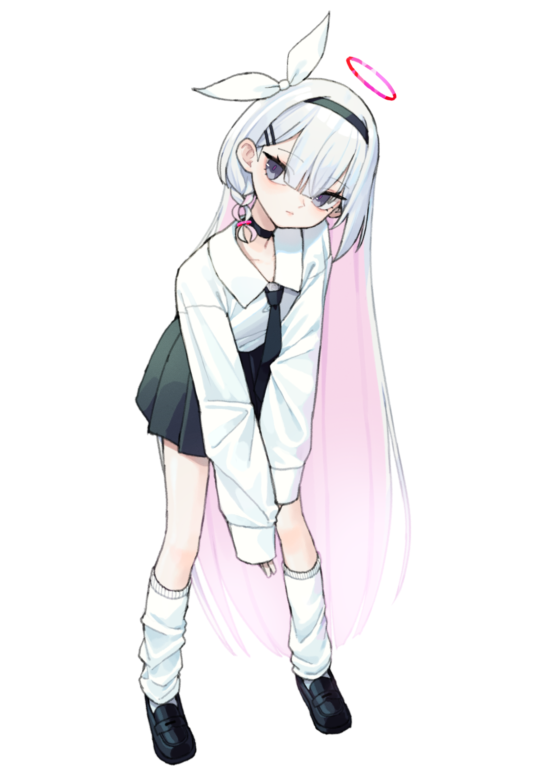 1girl 28_(282teeth) absurdres alternate_costume black_choker black_eyes black_hairband black_necktie black_shoes black_skirt blue_archive braid choker closed_mouth collared_shirt colored_inner_hair hairband halo highres long_hair long_sleeves multicolored_hair necktie pink_hair plana_(blue_archive) pleated_skirt red_halo shirt shoes simple_background single_braid skirt socks solo white_background white_hair white_shirt white_socks