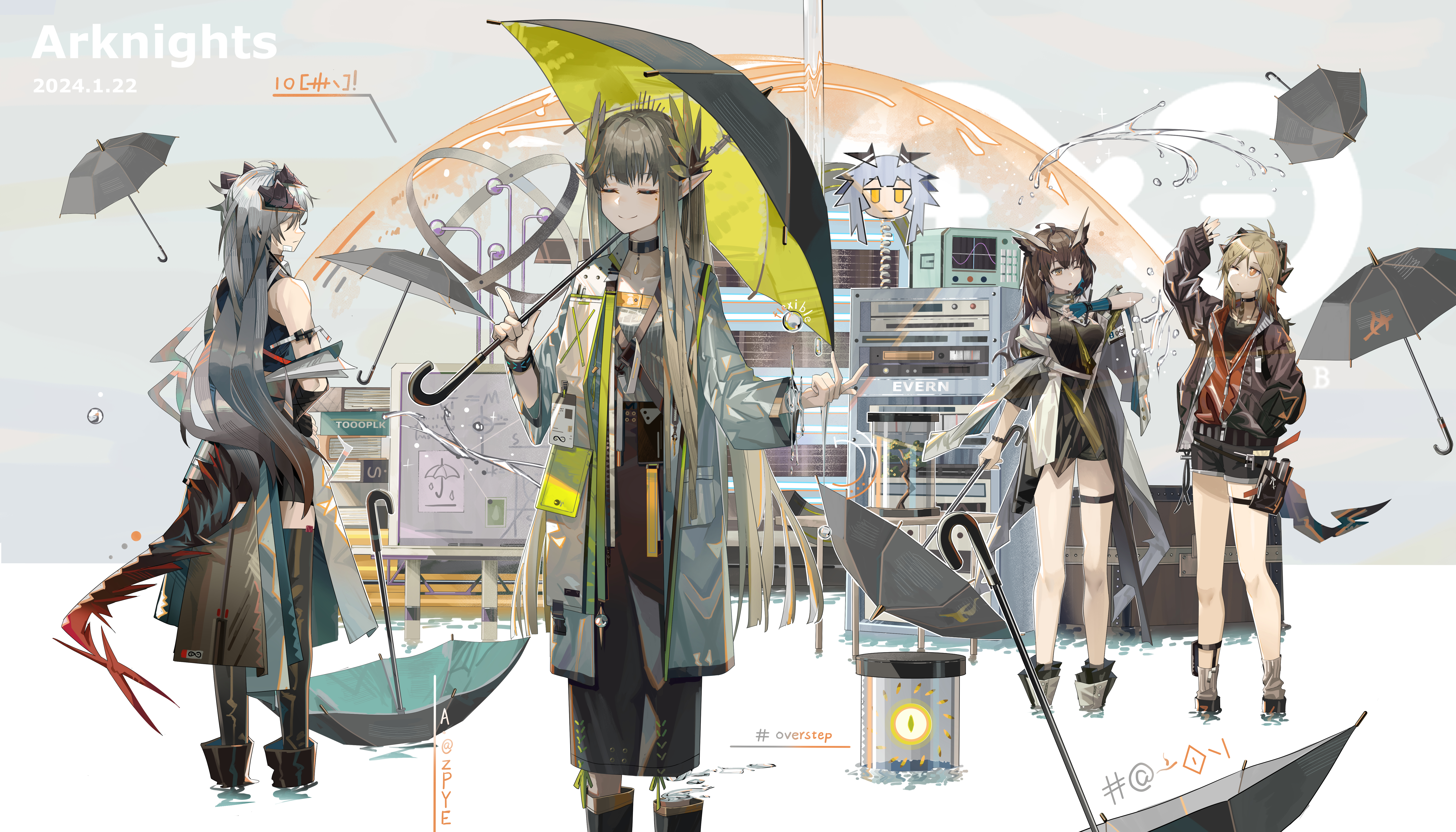 4girls absurdres arknights bandage_on_face bandages black_choker black_dress black_gloves black_shirt black_shorts black_thighhighs blue_gloves blush book book_stack boots brown_footwear brown_hair brown_jacket choker closed_eyes coat commentary_request copyright_name dated dissolving dragon_girl dragon_horns dragon_tail dress energy_barrier faceless faceless_female feather_hair fingerless_gloves gloves grey_background grey_hair hand_in_pocket hand_up highres holding holding_umbrella hood hoodie horns id_card ifrit_(arknights) ifrit_(lone_trail)_(arknights) infection_monitor_(arknights) jacket kanshio lab_coat light_brown_hair long_hair long_sleeves looking_up muelsyse_(arknights) multiple_girls object_request official_alternate_costume one_eye_closed orange_eyes orange_hoodie pouch ptilopsis_(arknights) radio red_coat rhine_lab_logo saria_(arknights) shirt short_hair shorts silence_(arknights) silence_the_paradigmatic_(arknights) simple_background smile spring_(object) tail thigh_boots thigh_strap thighhighs umbrella wading water whiteboard yellow_eyes