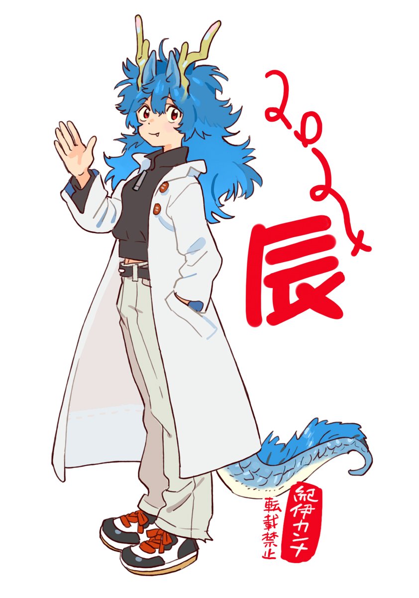 1girl 2024 animal_ears antlers black_shirt black_shoes blue_hair brown_pants chinese_zodiac closed_mouth coat collared_coat collared_shirt cropped_shirt dated dragon_girl dragon_tail fang fang_out full_body hair_between_eyes hand_in_pocket highres horns kiikanna long_hair long_sleeves looking_at_viewer messy_hair midriff_peek new_year original pants red_eyes shirt shoes simple_background smile sneakers solo standing tail translation_request white_background white_coat white_shoes year_of_the_dragon zipper_pull_tab