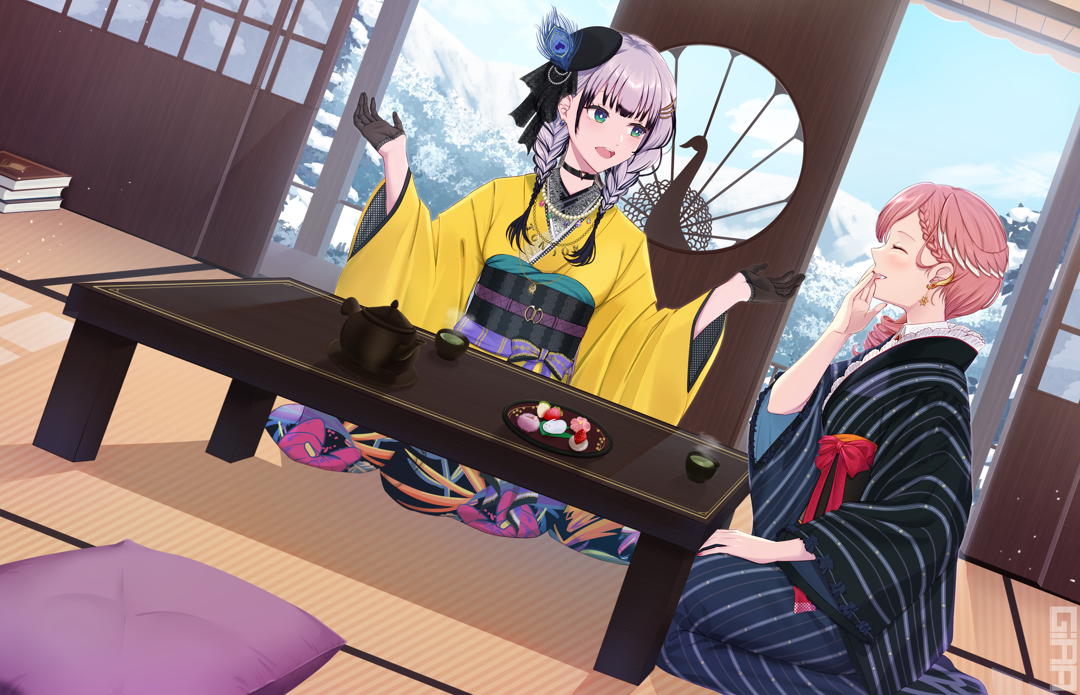 2girls absurdres beret black_gloves black_hair black_headwear black_kimono black_sash bow braid bright_pupils choker closed_eyes collared_shirt cup drill_hair drill_ponytail earrings food furisode girarikyo gloves green_eyes green_tea grey_hair hair_over_shoulder hat hat_feather head_wings highres hololive hololive_indonesia japanese_clothes jewelry kimono kneeling long_sleeves multicolored_hair multiple_girls o-ring o-ring_choker obi open_mouth pavolia_reine pavolia_reine_(new_year) peacock_feathers pink_hair purple_bow red_bow red_nails sash shirt sky snow streaked_hair striped_clothes striped_kimono table takane_lui takane_lui_(new_year) tea teacup teapot teeth tilted_headwear tree triangle twin_braids upper_teeth_only vertical-striped_clothes vertical-striped_kimono virtual_youtuber waist_bow white_pupils wide_sleeves wings yellow_kimono