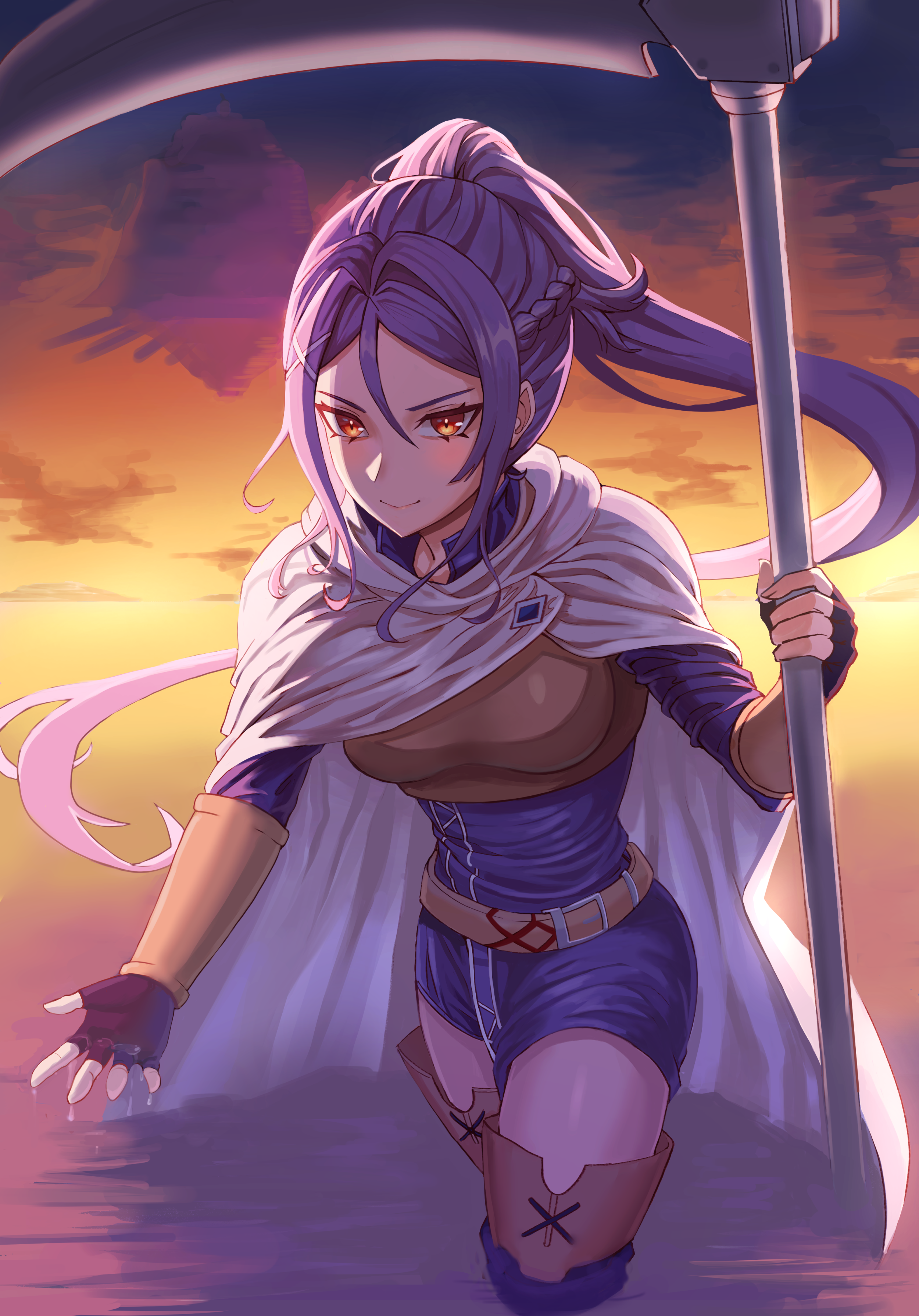 1girl absurdres belt cloak commentary_request fingerless_gloves gloves hair_ornament highres holding holding_scythe holding_weapon long_hair long_sleeves mito_(sao) oro_(lsg0624) purple_hair red_eyes scythe solo sunlight sunset sword_art_online sword_art_online_progressive weapon