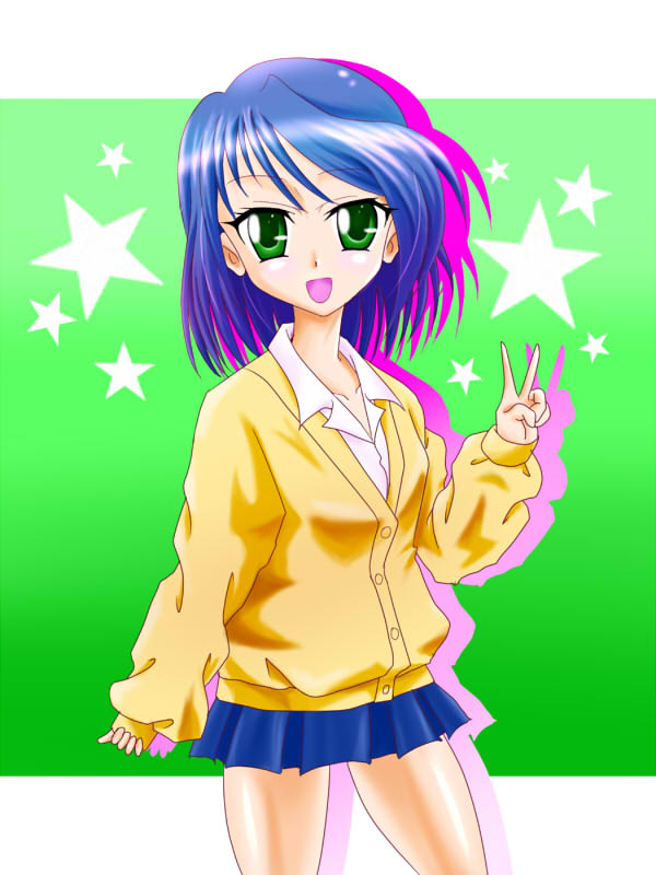 1girl blue_hair female_focus green_eyes madoka_(onmyou_taisenki) onmyou_taisenki open_mouth skirt smile solo star_(symbol) v