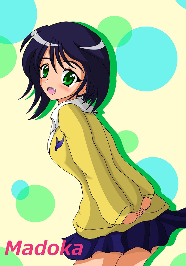 blue_hair breasts green_eyes madoka_(onmyou_taisenki) medium_breasts onmyou_taisenki short_hair skirt