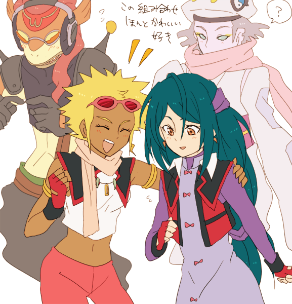 1boy 3girls blonde_hair dark-skinned_female dark_skin glasses_on_head hat headphones jacket kanna_(onmyou_taisenki) kanro_no_kuradayuu long_hair mizuki_(onmyou_taisenki) multiple_girls onmyou_taisenki shikigami_(onmyou_taisenki) shuusui_no_erekiteru smile translation_request