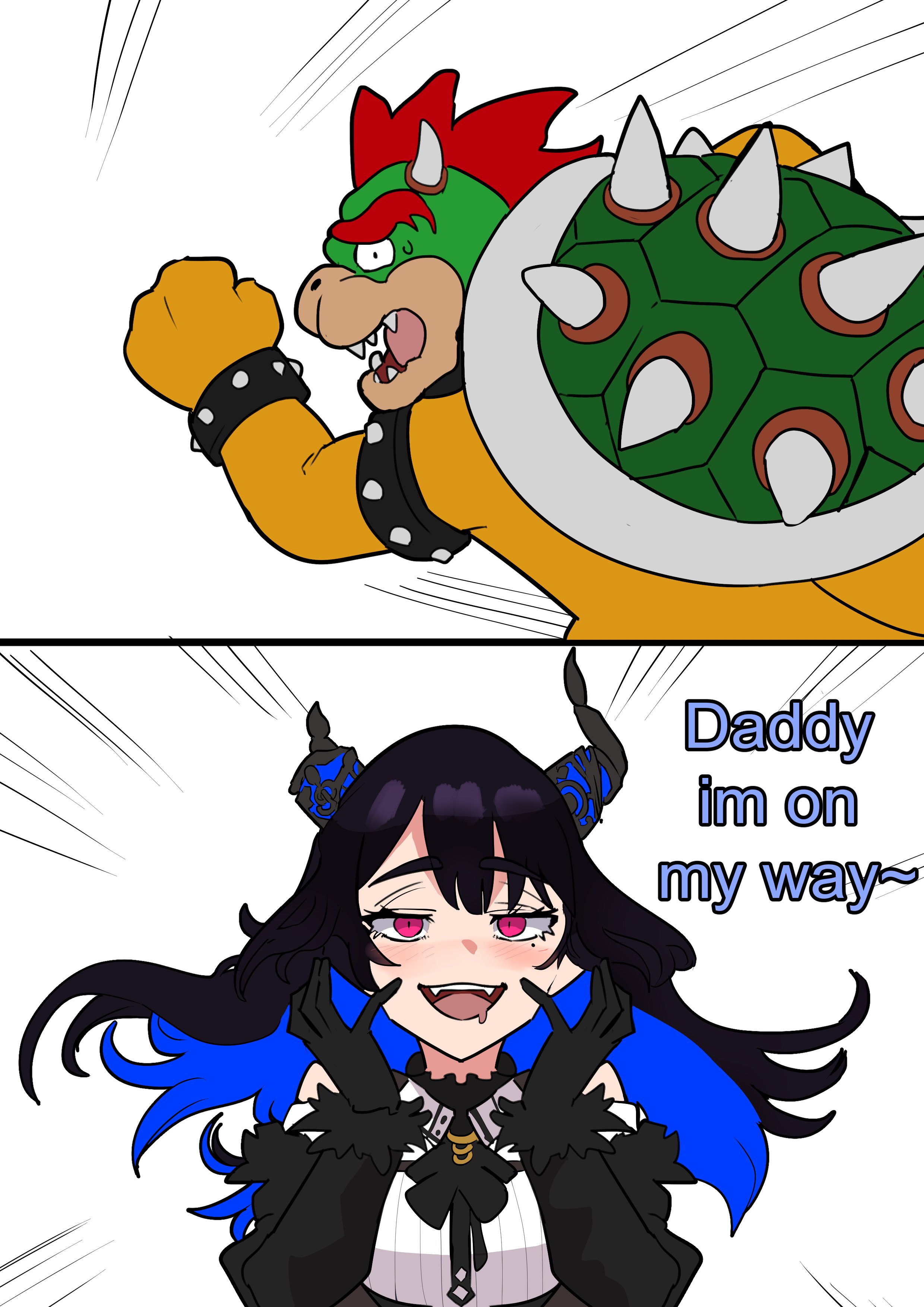 1boy 1girl absurdres asymmetrical_horns bare_shoulders black_hair blue_hair blush bowser bracelet colored_inner_hair daaku_(koizumi_arata) demon_horns english_text hair_ornament highres hololive hololive_english horns impending_doom jewelry long_hair mario_(series) meme mole mole_under_eye multicolored_hair nerissa_ravencroft nintendo open_mouth pink_eyes red_hair sharp_teeth spiked_bracelet spiked_shell spikes teeth turtle_shell two-tone_hair uneven_horns verbalase's_$50k_hazbin_hotel_amv_(meme) virtual_youtuber