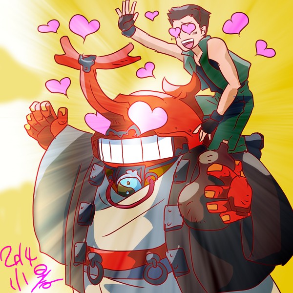 1boy akagane_no_isoroku exoskeleton heart horns onmyou_taisenki saigou_teru shikigami_(onmyou_taisenki) smile yin_yang