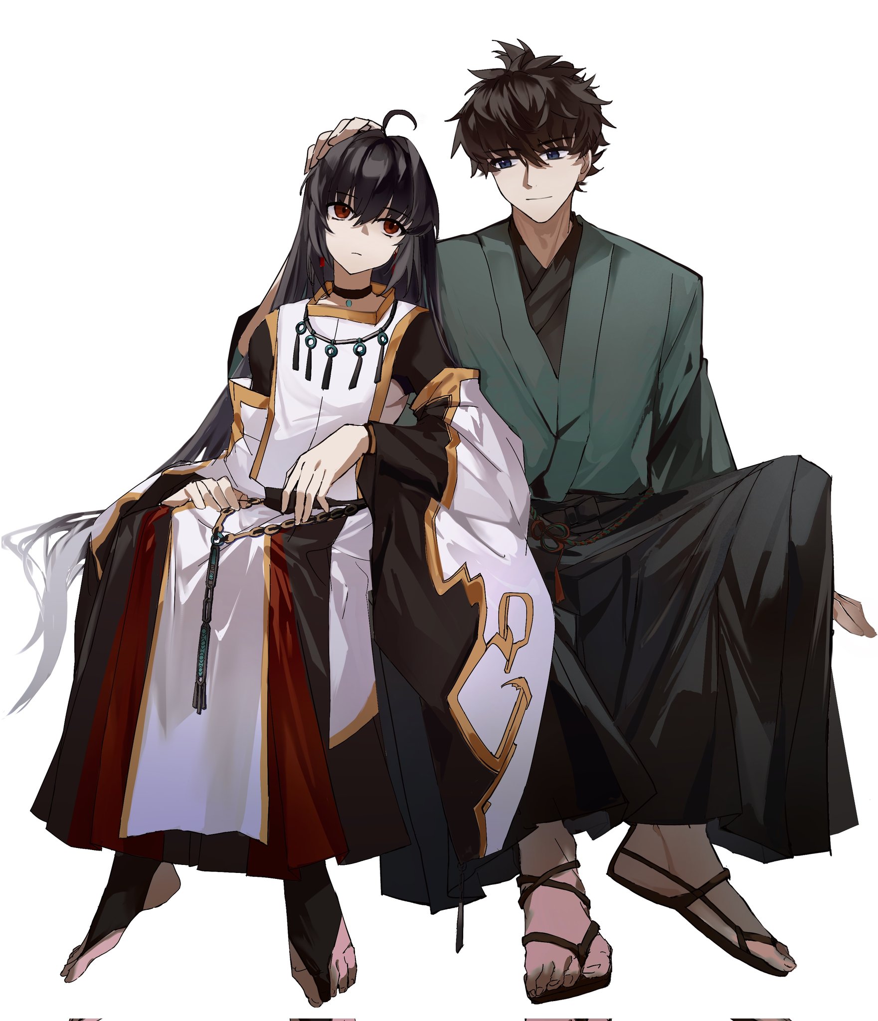 1boy 1other ahoge androgynous black_hair black_hakama blue_eyes blue_kimono detached_sleeves fate/grand_order fate/samurai_remnant fate_(series) hair_down hair_intakes hakama hand_on_another's_head highres japanese_clothes jewelry jiang_(bolidididi) katana kimono long_hair miyamoto_iori_(fate) necklace partially_toeless_legwear red_eyes sidelocks sitting sword topknot very_long_hair waraji weapon white_background yamato_takeru_(fate) yamato_takeru_(third_ascension)_(fate)
