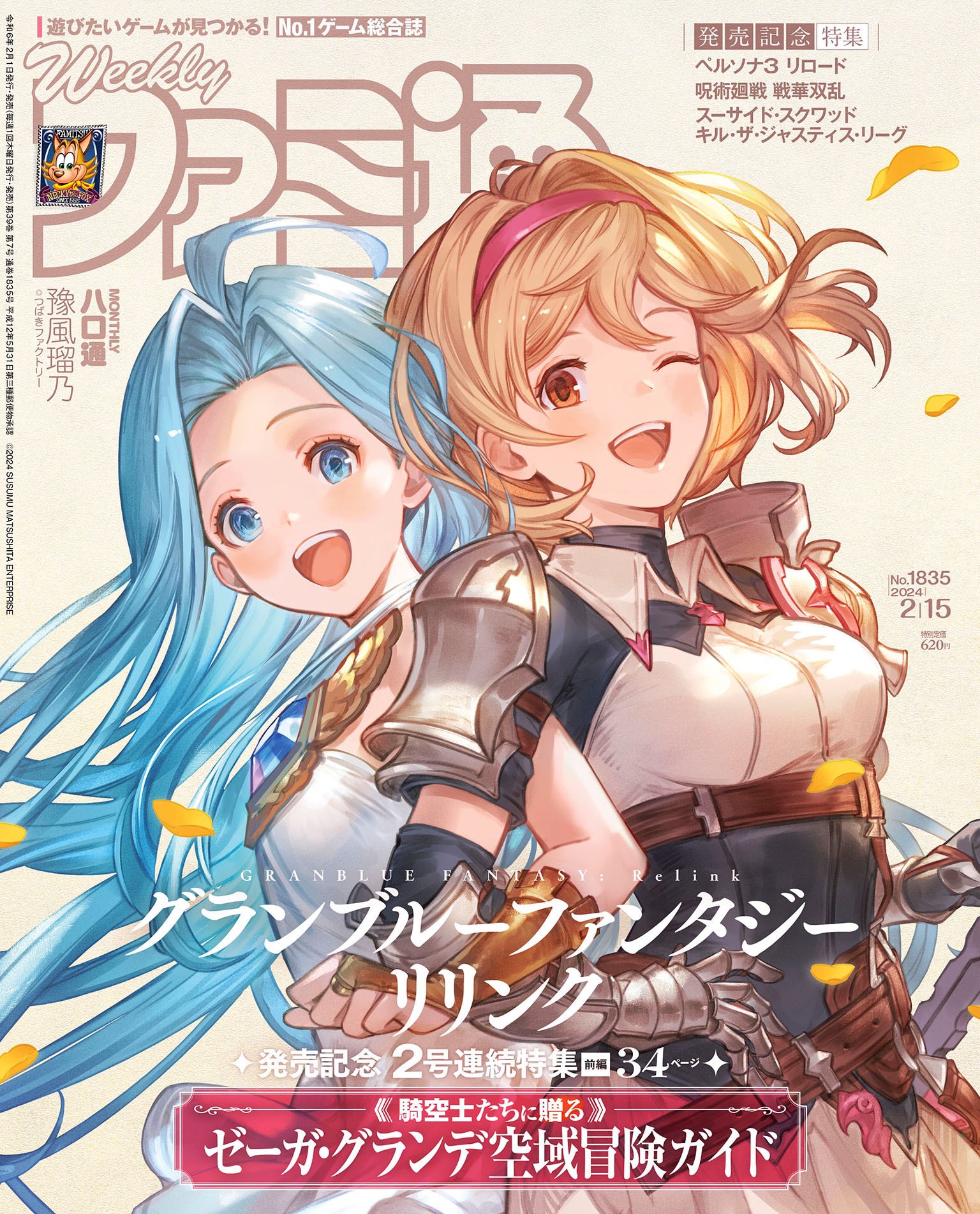 2girls ahoge armor blonde_hair blue_eyes blue_hair bridal_gauntlets brown_eyes cover djeeta_(granblue_fantasy) famitsu gauntlets granblue_fantasy granblue_fantasy:_relink hairband highres light_blue_hair locked_arms long_hair looking_at_viewer lyria_(granblue_fantasy) magazine_cover multiple_girls official_alternate_costume official_art one_eye_closed open_mouth rebelwear_(granblue_fantasy) shoulder_armor upper_body very_long_hair