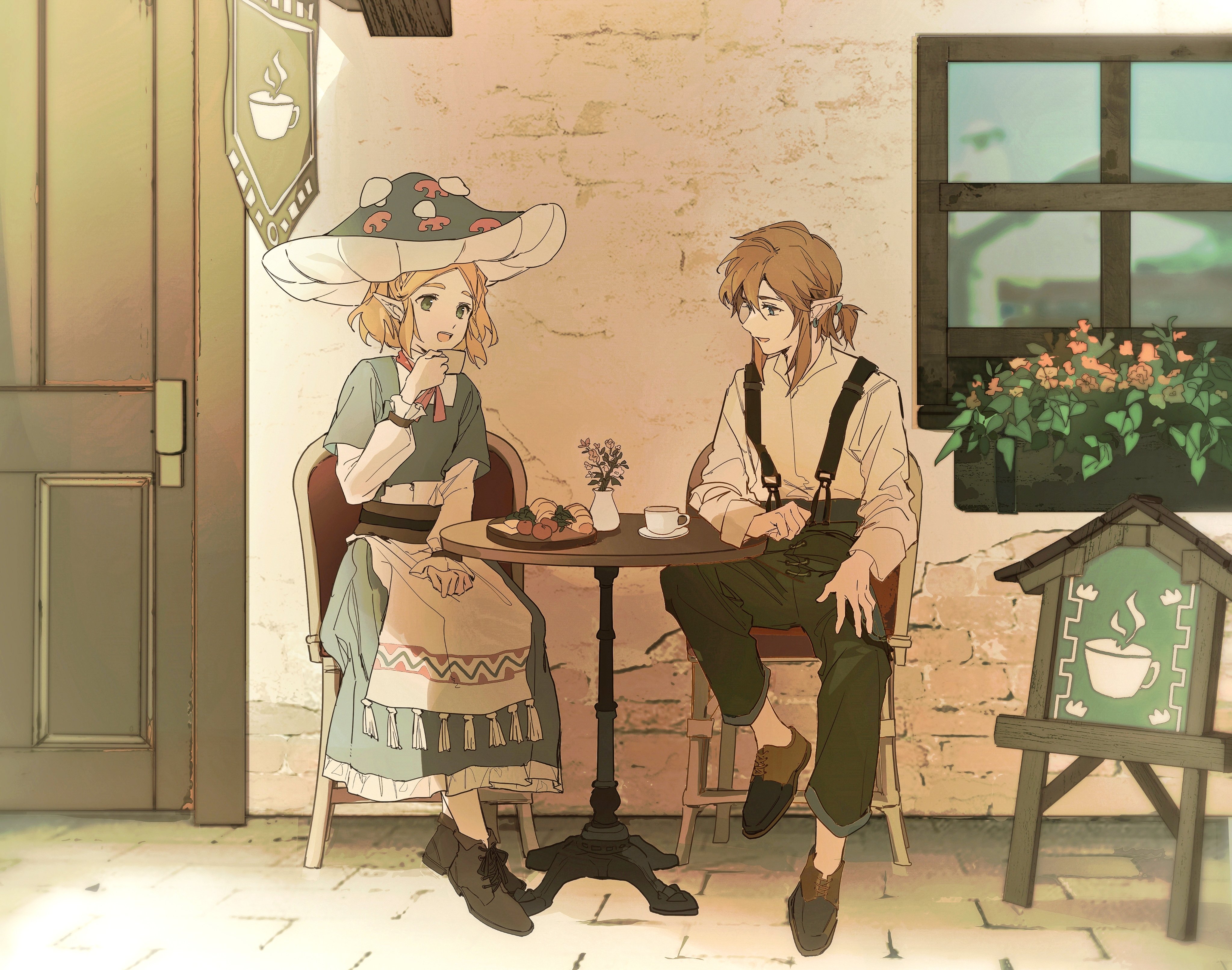 1boy 1girl absurdres animal_ears apron blonde_hair blue_dress braid brick_road cafe chair coffee collared_shirt crown_braid cup door dress flower full_body hair_between_eyes highres holding holding_cup link long_dress long_sleeves looking_at_another low_ponytail medium_hair mushroom_hat neck_ribbon nintendo open_mouth outdoors pants parted_bangs parted_lips pointy_ears ponytail princess_zelda ribbon shirt shirt_under_dress shoes short_hair sidelocks sitting smile suspenders table talking the_legend_of_zelda the_legend_of_zelda:_tears_of_the_kingdom vase waist_apron white_shirt window yuno_11_02