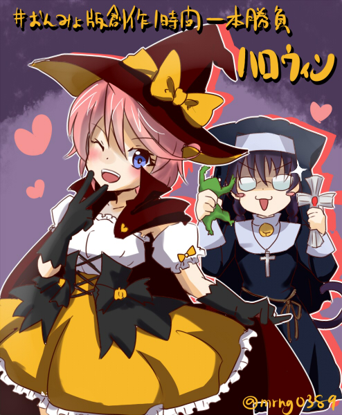 asou_rina cross digimon halloween halloween_costume heart jouzenji_momo looking_at_viewer nun one_eye_closed smile wink