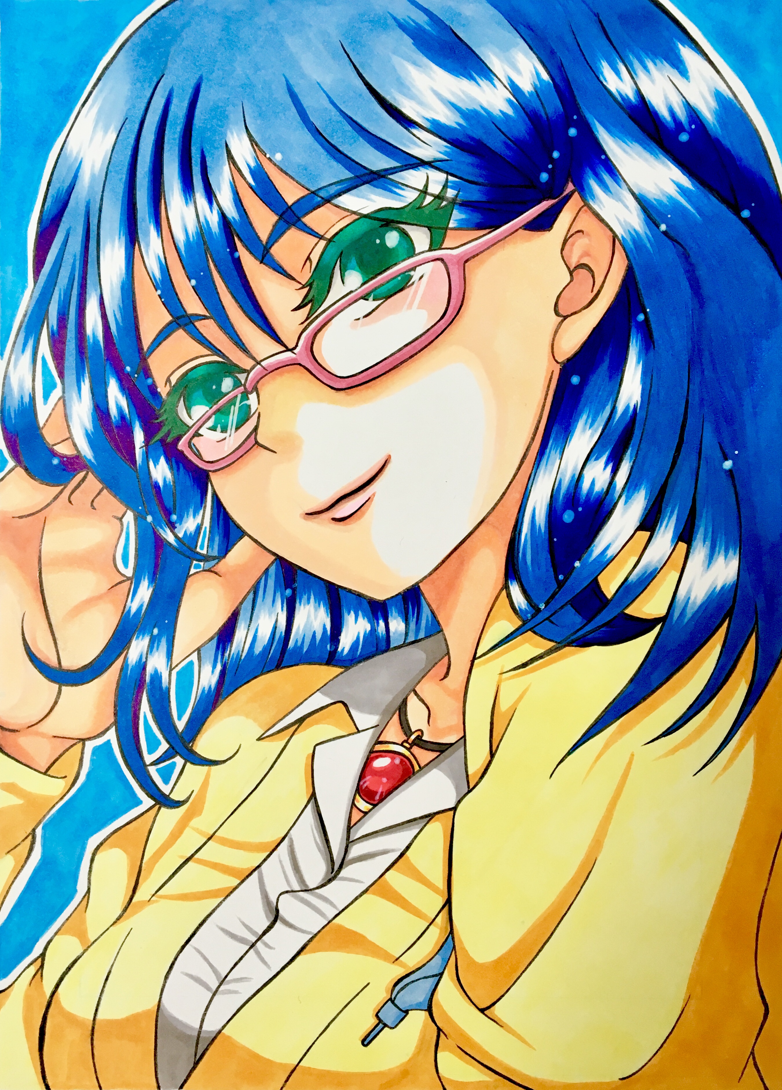 absurdres blue_hair breasts glasses green_eyes highres madoka_(onmyou_taisenki) onmyou_taisenki short_hair smile