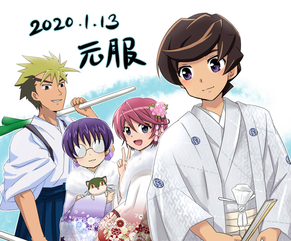 2boys 2girls asou_rina cat jouzenji_momo kamiya_ryuuji looking_at_viewer multiple_boys multiple_girls onmyou_taisenki tachibana_riku toraji_(onmyou_taisenki)