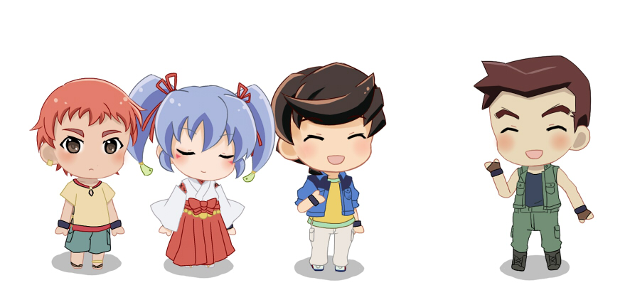 1girl 3boys asuka_souma hair_ornament hairpin japanese_clothes long_hair magatama miko multiple_boys nazuna_(onmyou_taisenki) onmyou_taisenki saigou_teru tachibana_riku twintails