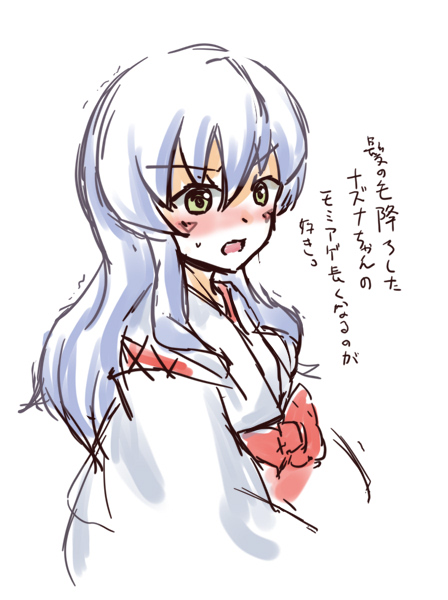 blush embarrassed green_eyes japanese_clothes japanese_text long_hair miko nazuna_(onmyou_taisenki) onmyou_taisenki open_mouth ribbon simple_background translation_request white_background