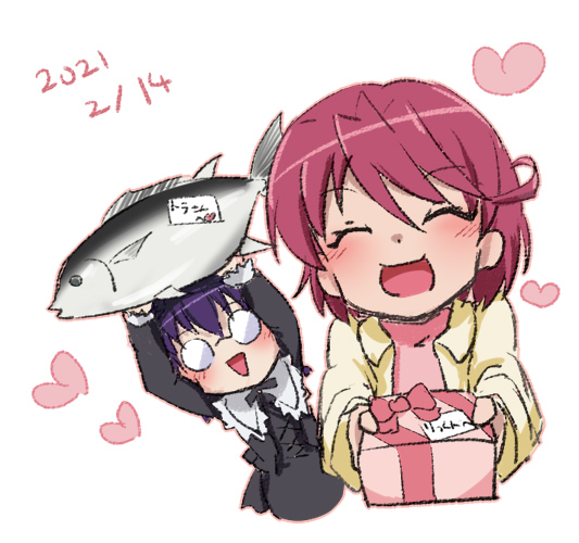 asou_rina fish gift heart jouzenji_momo onmyou_taisenki open_mouth pink_hair purple_hair smile