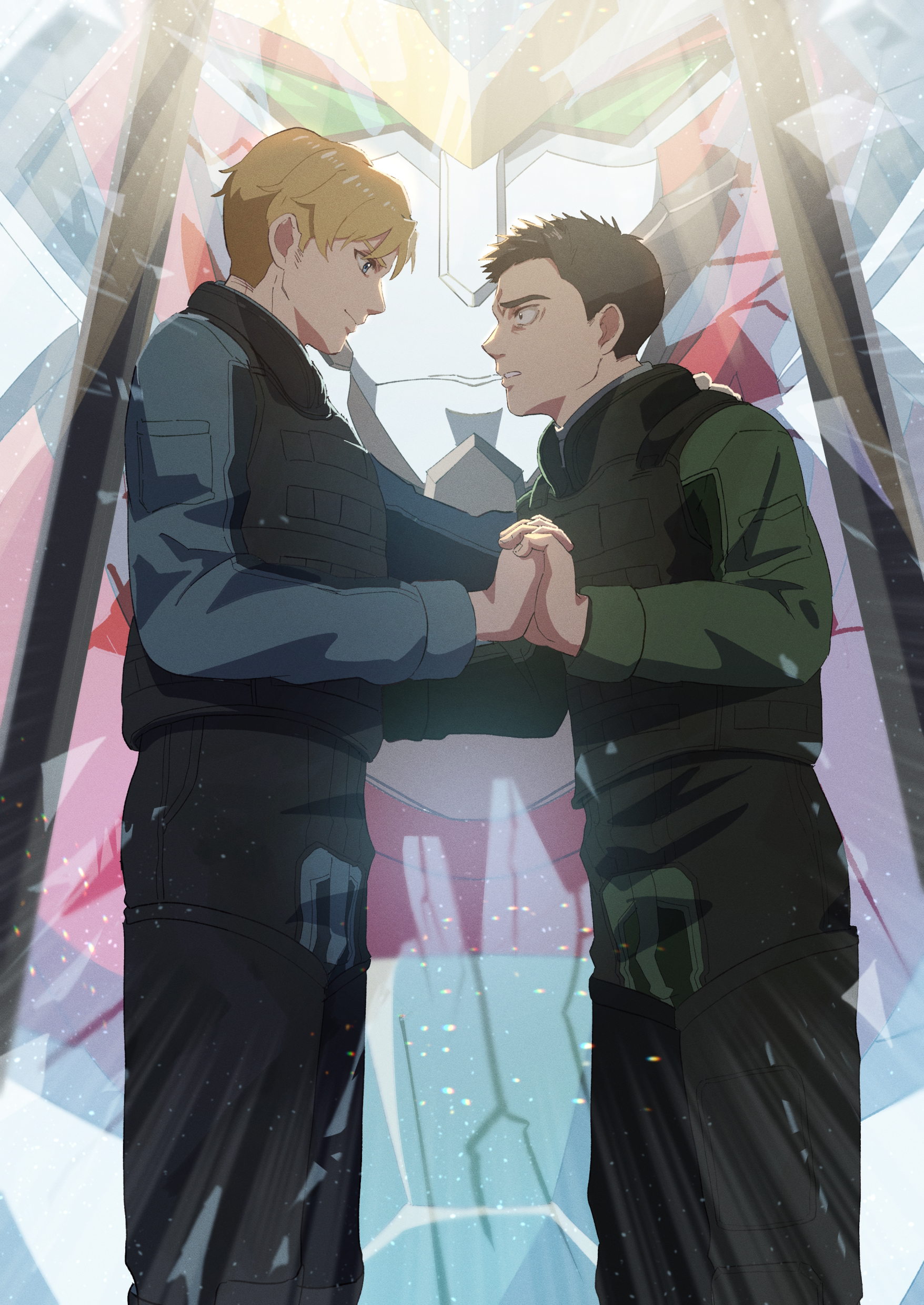 2boys absurdres ao_isami black_hair black_pants black_vest blonde_hair blue_eyes blue_shirt bravern eye_contact green_shirt highres holding holding_hands holding_own_hair lewis_smith long_sleeves looking_at_another mecha multiple_boys pants robot sako_(oyatutabero) shirt short_hair standing vest yaoi yuuki_bakuhatsu_bang_bravern