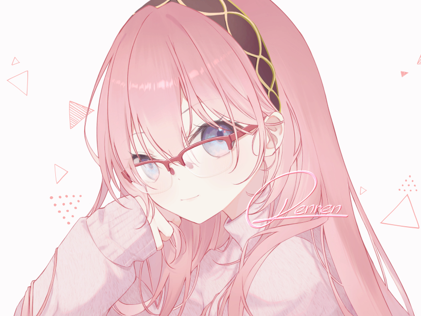 1girl artist_name black_hairband blue_eyes closed_mouth commentary glasses hairband long_hair long_sleeves looking_at_viewer megurine_luka over-rim_eyewear pink_hair pink_sweater project_diva_(series) red-framed_eyewear renren_(pixiv22963369) semi-rimless_eyewear sleeves_past_wrists smile solo sweater triangle upper_body very_long_hair vocaloid megurine_luka_(yurufuwa_koode)