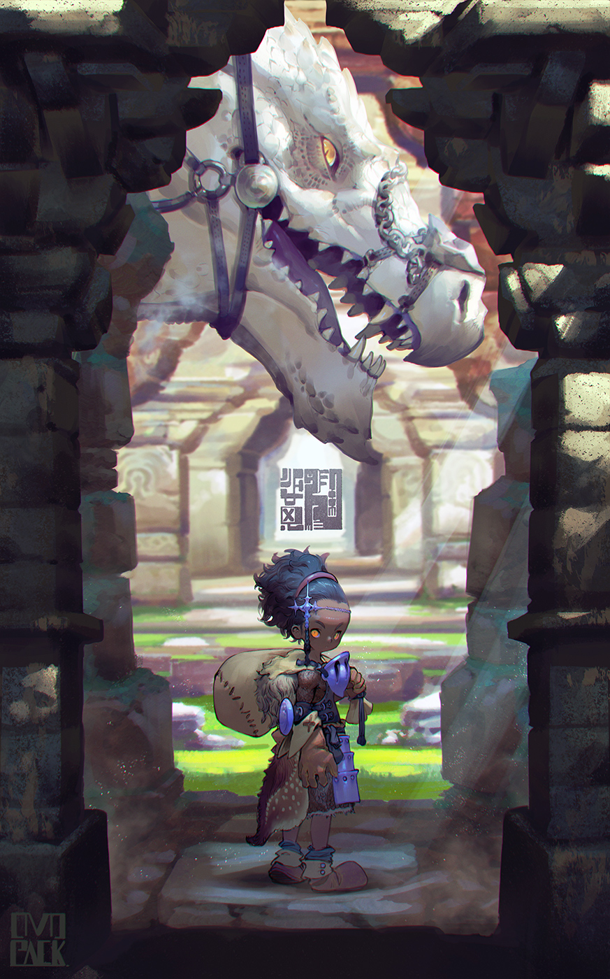 1boy arch armor artist_name backpack bag black_hair brown_footwear brown_gloves chain child circlet commentary day dragon expressionless fantasy from_side gloves glowing glowing_eye hair_pulled_back hairband highres holding_strap japanese_armor kusazuri light_rays looking_at_viewer murayama_ryota o-ring open_mouth orange_eyes original outdoors pelt pink_hairband reins scenery sharp_teeth shoes size_difference slit_pupils standing teeth vanishing_point western_dragon wide_shot yellow_eyes