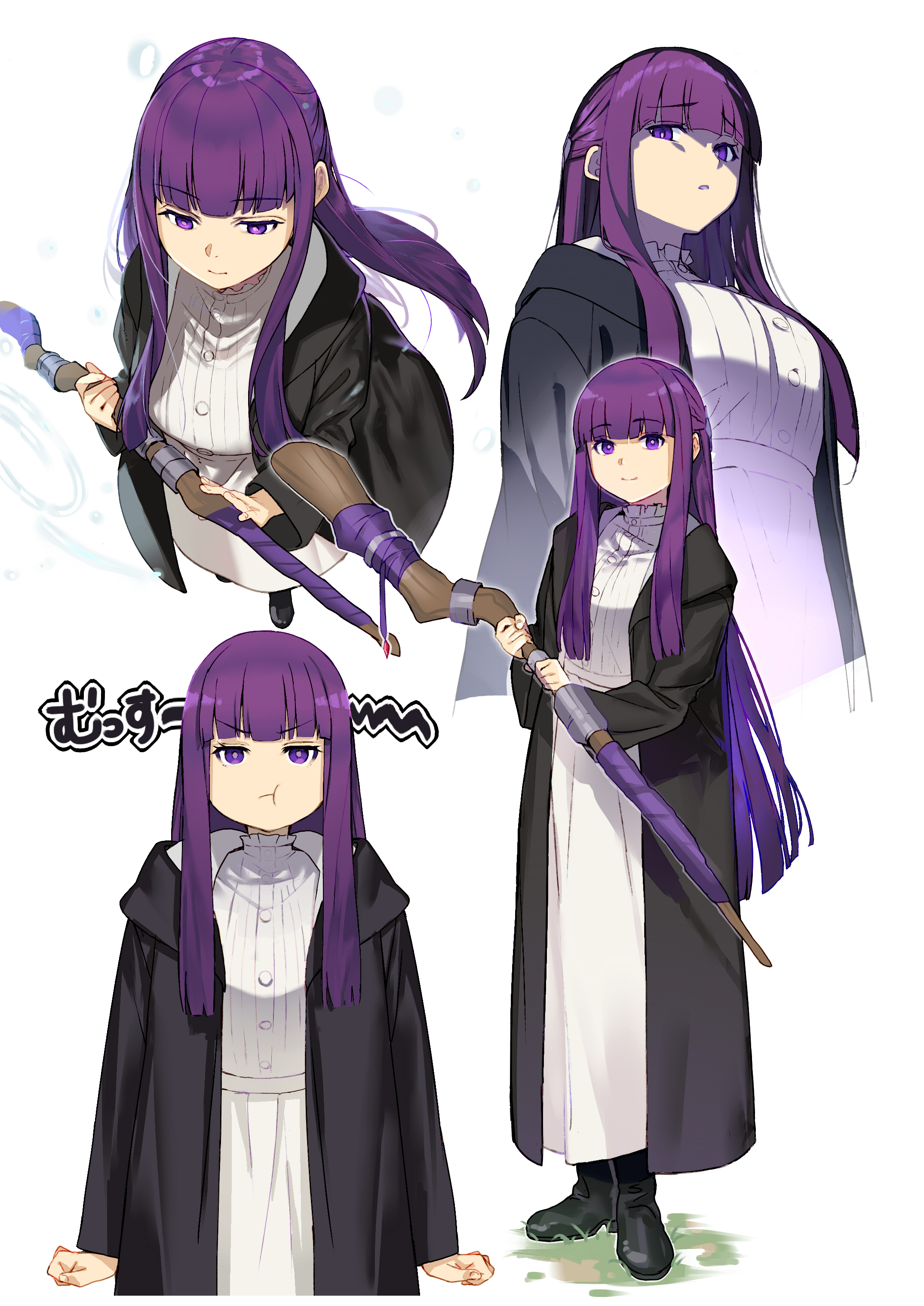 1girl absurdres blunt_bangs breasts disgust dress multiple_expressions fern_(sousou_no_frieren) glaring grimace happy highres light_smile long_hair long_sleeves looking_at_viewer multiple_views pout purple_eyes purple_hair shaded_face sidelocks simple_background sousou_no_frieren tsukudani_(ore624) white_background white_dress