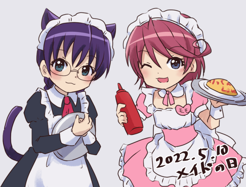 animal_ears asou_rina blush cat_ears cat_girl cat_tail digimon glasses jouzenji_momo looking_at_viewer maid one_eye_closed tail wink