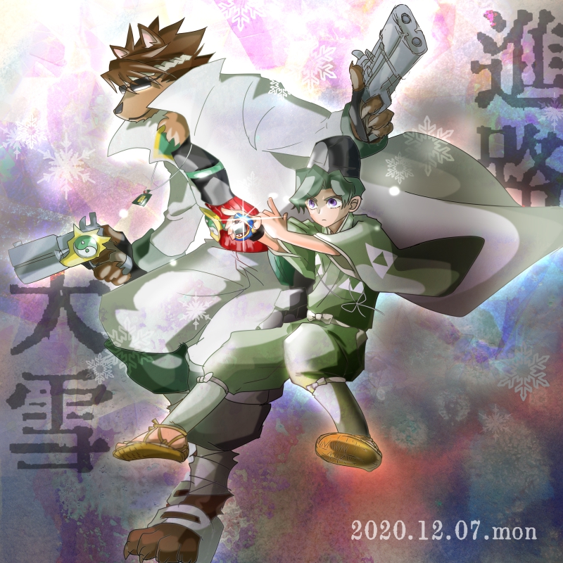 2boys furry gun multiple_boys onmyou_taisenki shikigami_(onmyou_taisenki) souka_no_onishiba taizan_(onmyou_taisenki) weapon yin_yang