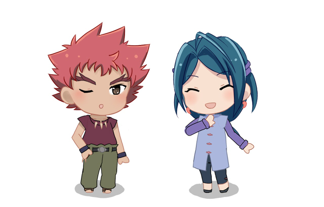 1boy 1girl asuka_yuuma blue_hair mizuki_(onmyou_taisenki) onmyou_taisenki red_hair simple_background white_background