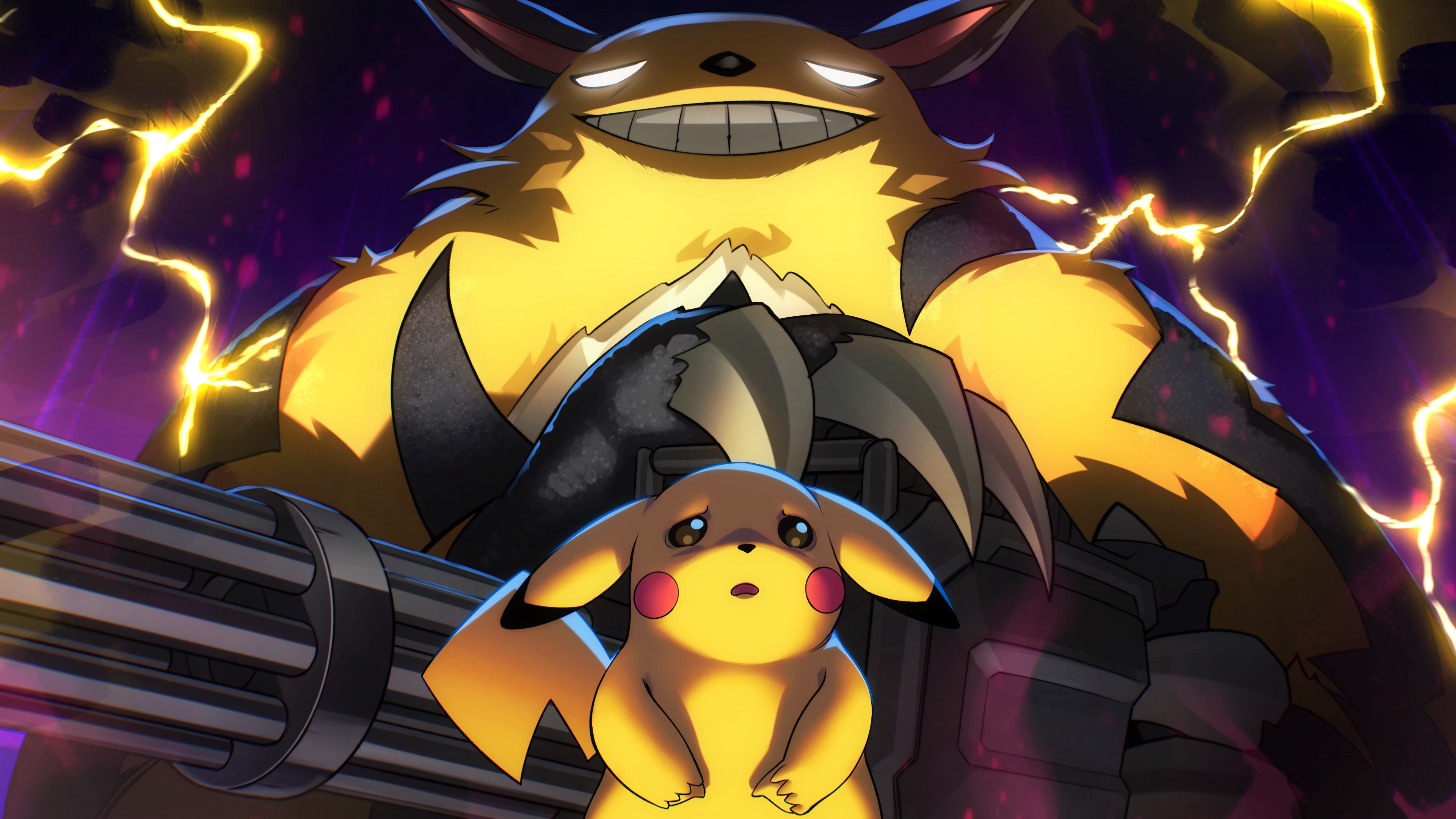absurdres claws crossover easterhands gatling_gun gen_1_pokemon glowing glowing_eyes grin grizzbolt gun highres holding holding_gun holding_weapon impending_doom lightning minigun nintendo no_humans no_pupils open_mouth pal_(creature) palworld pikachu pokemon pokemon_(creature) smile teeth weapon
