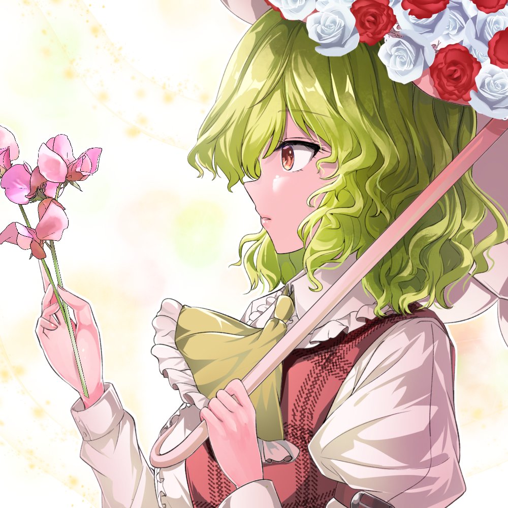 1girl flower from_side green_hair holding holding_flower holding_umbrella jacket kazami_yuuka pink_flower plaid_clothes plaid_jacket red_eyes red_flower red_jacket shirt solo touhou umbrella umbrella_flower white_background white_flower white_shirt y2