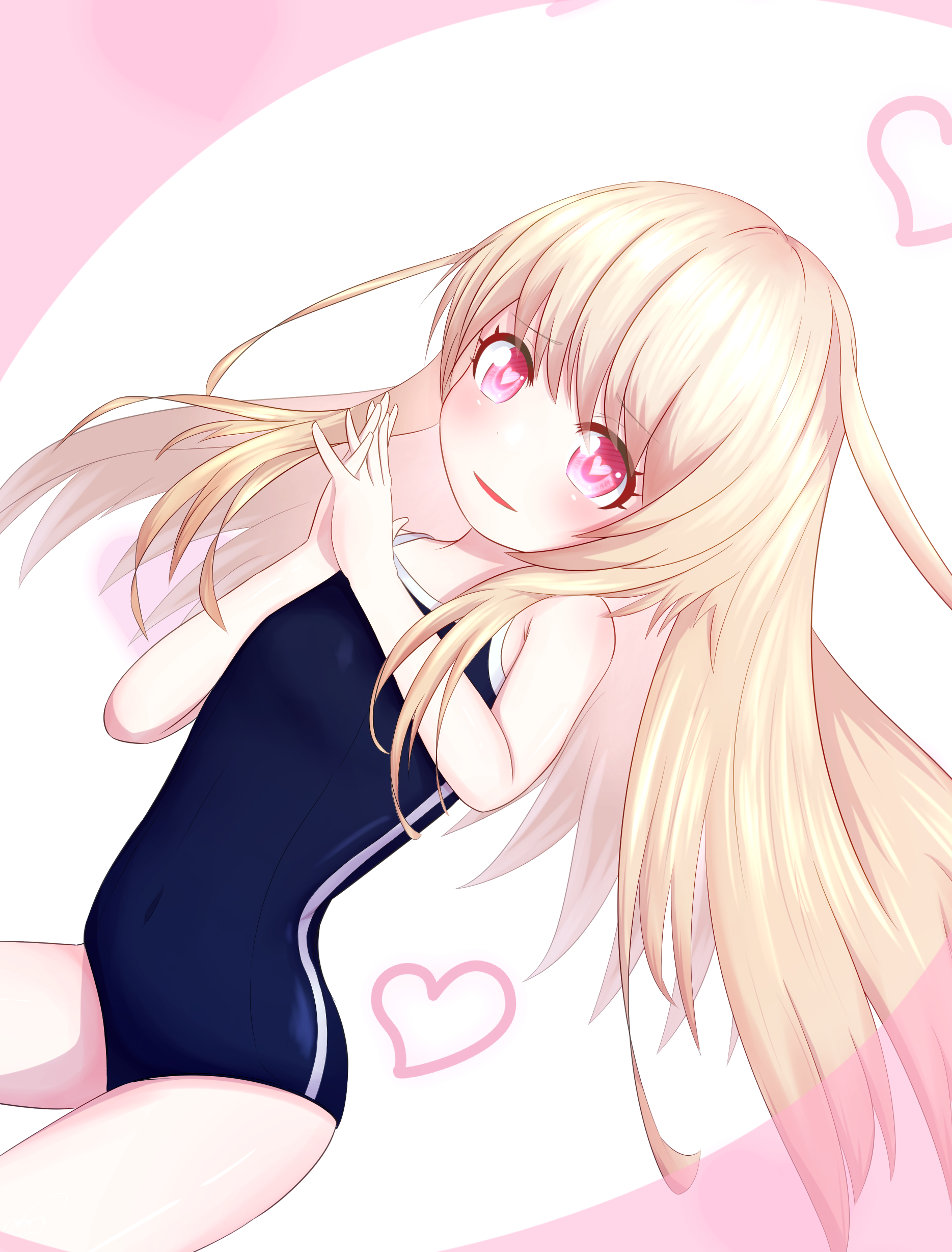 1girl absurdres alternate_costume blonde_hair blush chaos_marie_(grimms_notes) grimms_notes heart heart-shaped_pupils highres long_hair no_hair_ornament open_mouth pink_background pink_eyes raised_eyebrows school_swimsuit smile solo swimsuit symbol-shaped_pupils white_background white_muffler