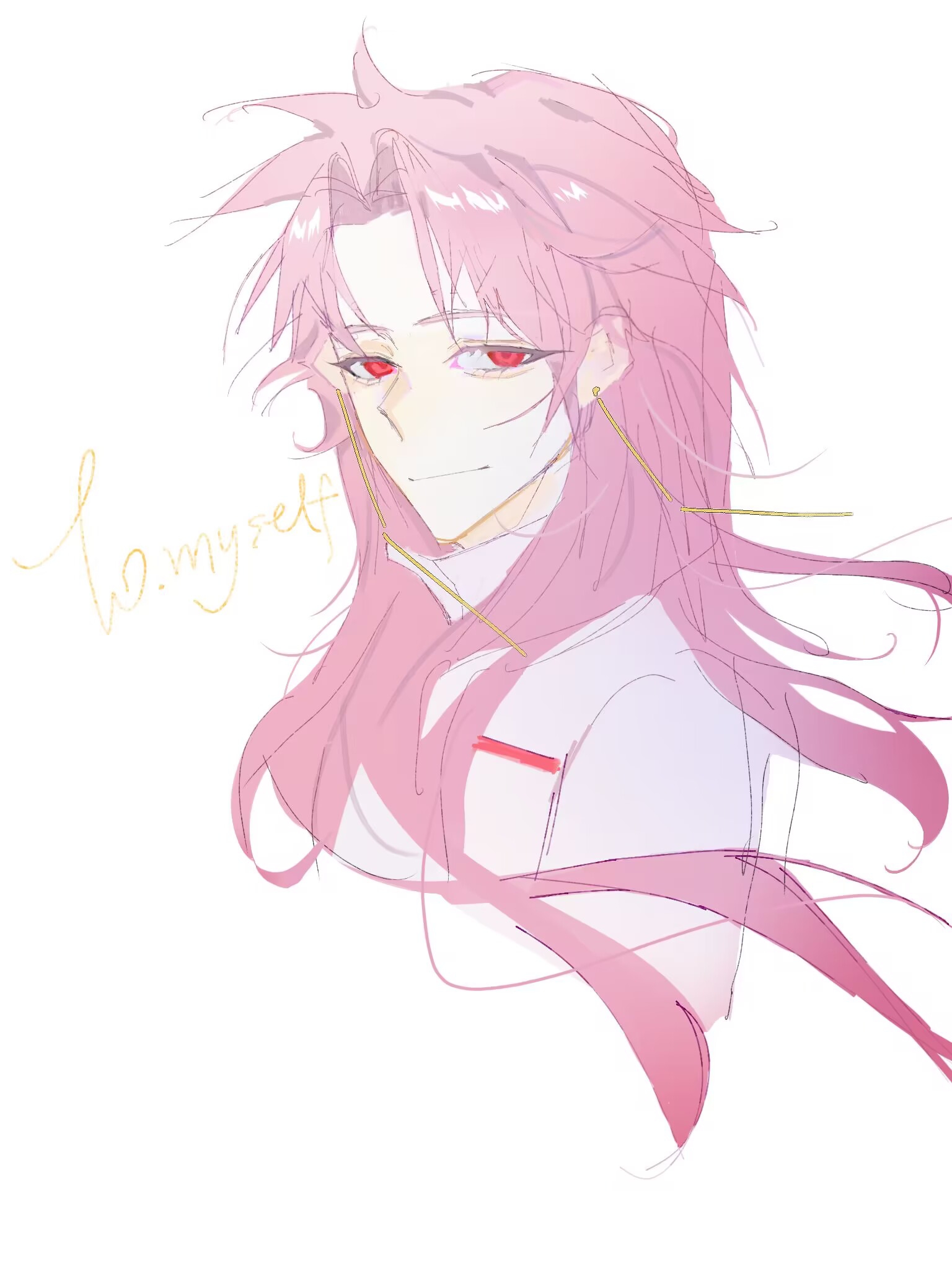 1boy chinese_commentary closed_mouth commentary_request earrings english_text hatsutori_hajime highres jewelry long_hair male_focus parted_bangs pink_hair red_eyes saibou_shinkyoku shirt simple_background sketch smile solo white_background white_shirt xinjinjumin1332005
