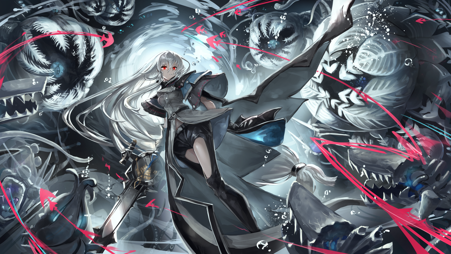 1girl air_bubble animal_request arknights belt belt_buckle black_belt black_hat black_jacket black_pants breasts bubble buckle clothing_cutout commentary_request floating_hair grey_hair grey_shirt hair_between_eyes hat highres holding holding_sword holding_weapon jacket long_hair medium_breasts on_(yattemasu) pants parted_lips red_eyes shirt skadi_(arknights) solo sword thigh_cutout unworn_hat unworn_headwear very_long_hair water weapon