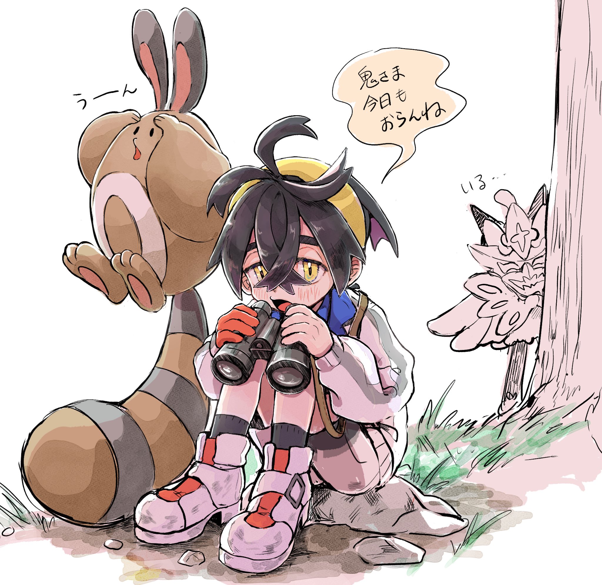 1boy binoculars black_hair black_socks blush commentary_request crossed_bangs gen_2_pokemon gloves hair_between_eyes hasu_(2157hasu) highres holding holding_binoculars jacket kieran_(pokemon) long_sleeves male_focus multicolored_hair nintendo ogerpon open_mouth pokemon pokemon_(creature) pokemon_scarlet_and_violet purple_hair red_gloves rock sentret shoes shorts simple_background single_glove sitting socks speech_bubble translation_request tree white_background yellow_eyes