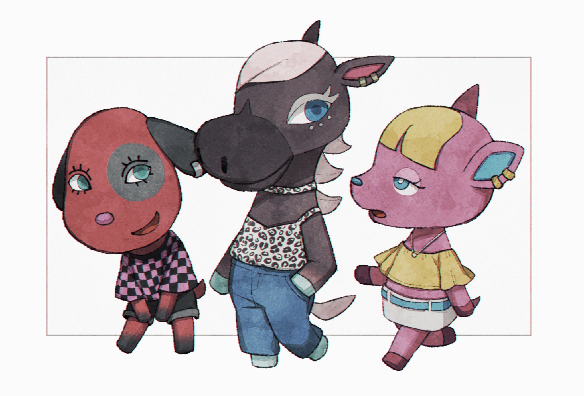 3girls :d animal_crossing animal_crossing:_new_horizons animal_ear_piercing aqua_belt aqua_eyes belt black_shirt black_shorts blonde_hair blue_eyes blue_pants border bright_pupils camisole checkered_clothes checkered_shirt cherry_(animal_crossing) choker closed_mouth commentary_request crop_top deer_girl denim dog_girl eyelashes fuchsia_(animal_crossing) furry furry_female grey_hair hand_in_pocket highres horse_girl jeans jewelry kaji_(oni_atat) looking_at_another looking_at_viewer multiple_girls necklace nintendo off-shoulder_shirt off_shoulder open_mouth outside_border pants pink_shirt print_camisole print_choker reneigh_(animal_crossing) shirt short_sleeves shorts simple_background skirt smile talking two-tone_shirt white_background white_border white_camisole white_choker white_pupils white_skirt yellow_shirt