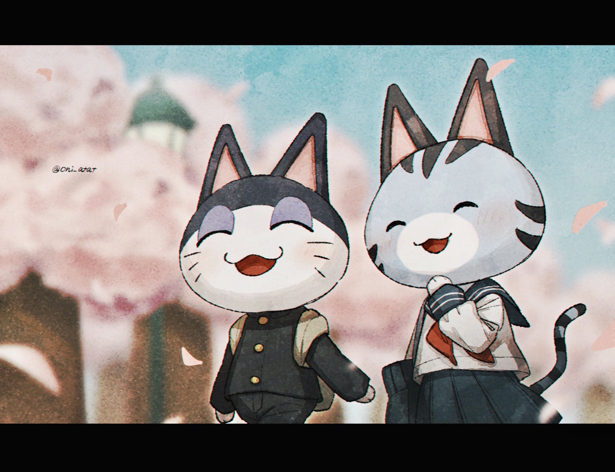 1boy 1girl :3 :d ^_^ animal_crossing artist_name backpack bag black_jacket black_pants blue_bag blue_sailor_collar blue_skirt blue_sky blurry blurry_background blush buttons cat_boy cat_girl cherry_blossoms closed_eyes commentary day falling_petals furry furry_female furry_male gakuran grey_bag hands_up highres jacket kaji_(oni_atat) lamppost laughing letterboxed lolly_(animal_crossing) long_sleeves neckerchief nintendo open_mouth outdoors pants petals pleated_skirt punchy_(animal_crossing) red_neckerchief sailor_collar school_bag school_uniform serafuku shirt shoulder_bag skirt sky sleeve_cuffs smile untranslatable_commentary tree twitter_username walking white_shirt