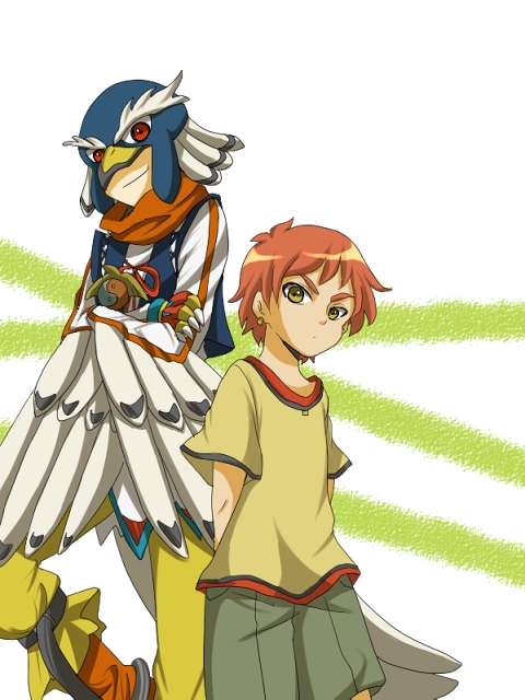 2boys asuka_souma beak feathers ikazuchi_no_fusanoshin mask multiple_boys onmyou_taisenki shikigami_(onmyou_taisenki)