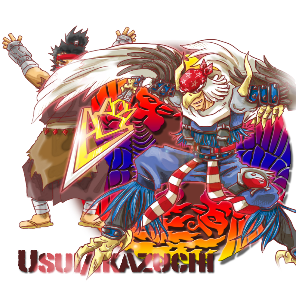 2boys ikazuchi_no_joniza lance mask multiple_boys muscular muscular_male onmyou_taisenki polearm shikigami_(onmyou_taisenki) shiranui_(onmyou_taisenki) smile weapon yin_yang