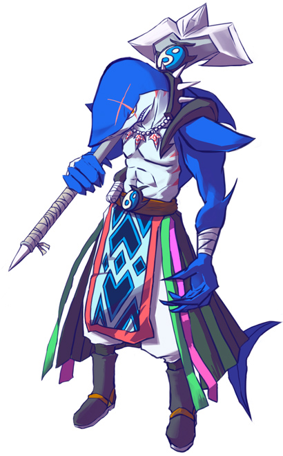 1boy bandages belt furry lance male_focus onmyou_taisenki polearm scar shark_boy shikigami_(onmyou_taisenki) shousetsu_no_magahoshi solo tail weapon yin_yang