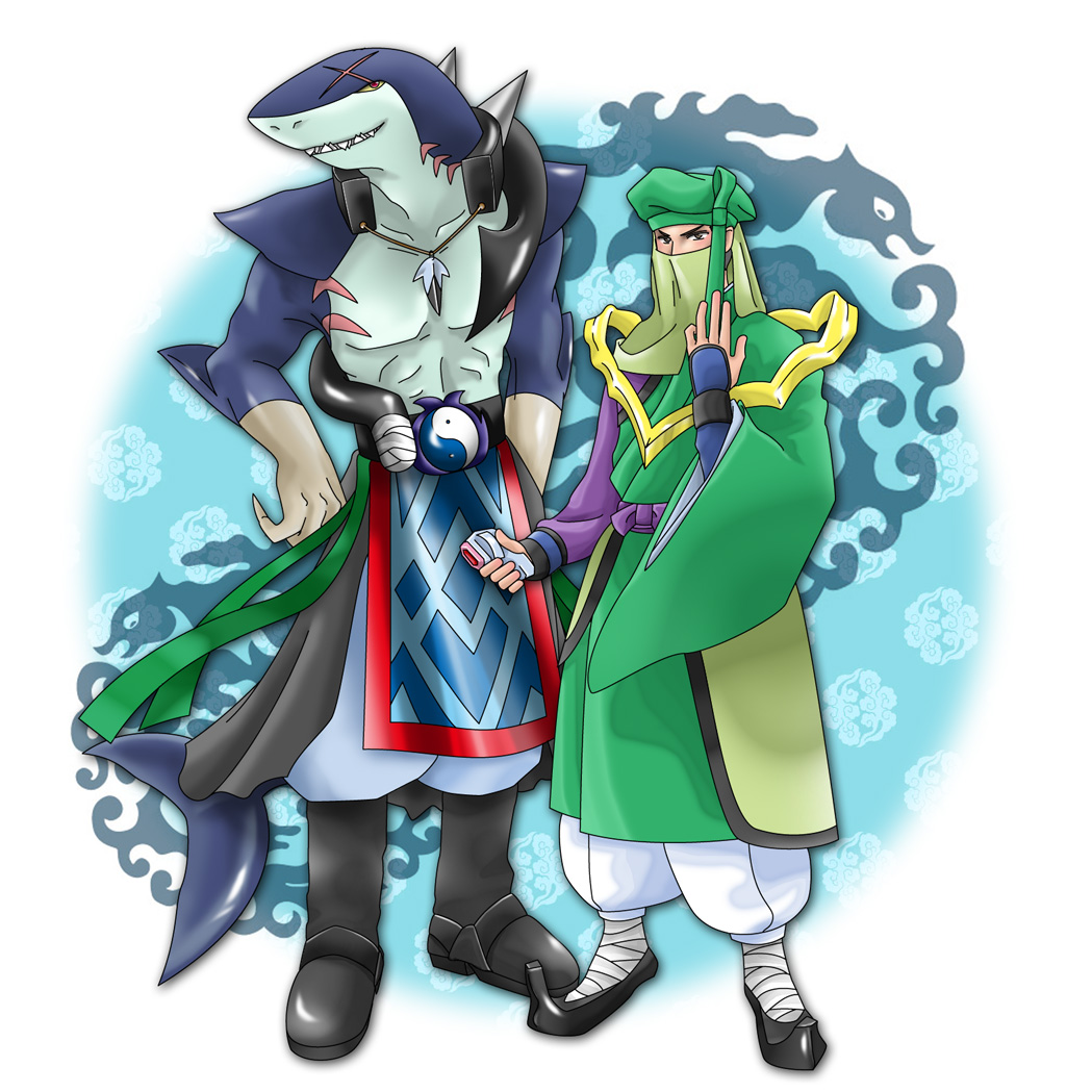 2boys furry mask multiple_boys muscular muscular_male onmyou_taisenki sharp_teeth shikigami_(onmyou_taisenki) shousetsu_no_magahoshi tail taishin_(onmyou_taisenki) teeth