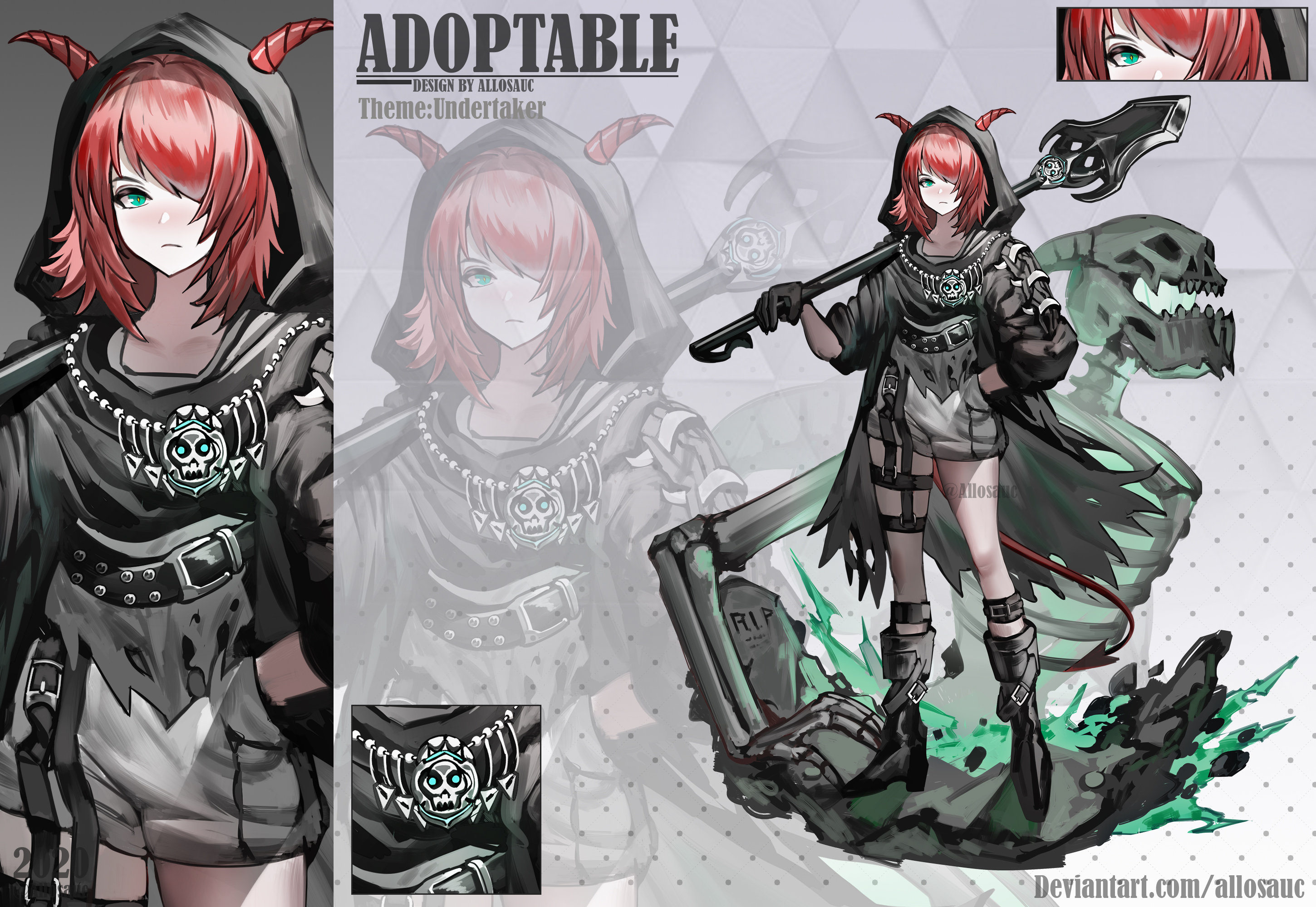 1girl 2020 adoptable allosauc aqua_eyes artist_name belt belt_buckle black_belt black_cloak black_footwear black_gloves black_hood boots buckle reference_sheet chest_belt cloak close-up closed_mouth collarbone commentary cowboy_shot creature_and_personification deviantart_username english_commentary english_text full_body gloves gradient_background grey_background hair_over_one_eye hand_on_own_hip high_heel_boots high_heels highres holding holding_weapon hood hood_up hooded_cloak horns jewelry leg_belt light_frown looking_at_viewer medium_hair multiple_belts multiple_views necklace original over_shoulder personification polka_dot polka_dot_background projected_inset red_hair red_horns ribbed_legwear shirt shoe_belt short_shorts shorts simple_background skeleton skull_necklace striped_horns studded_belt the_undertaker_(wwe) thigh_belt thigh_strap tombstone torn_cloak torn_clothes torn_shirt triangle_background weapon weapon_over_shoulder weapon_request white_shirt white_shorts